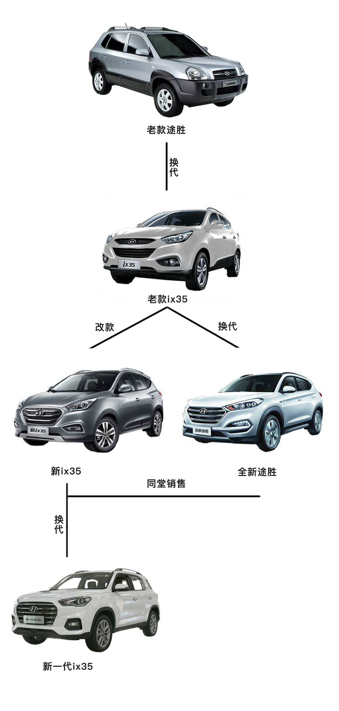 首先,第一代的途胜换代成了ix35,接着ix35的改款车型就是现款的新ix35,而现款的全新途胜就是ix35的换代车型,出生于2015年,并且与新ix35同堂销售。