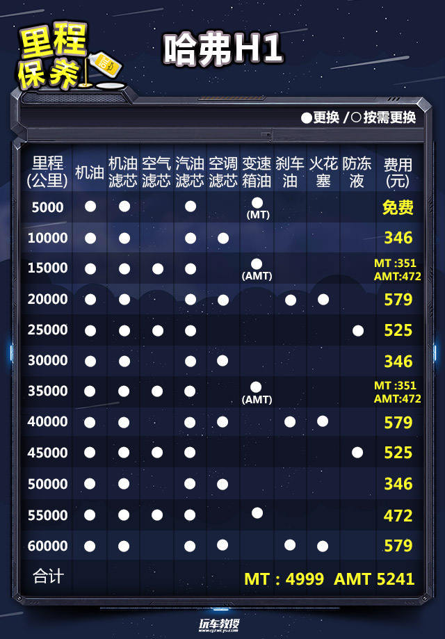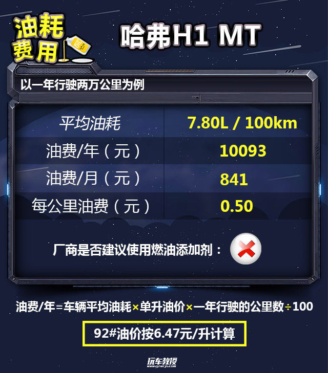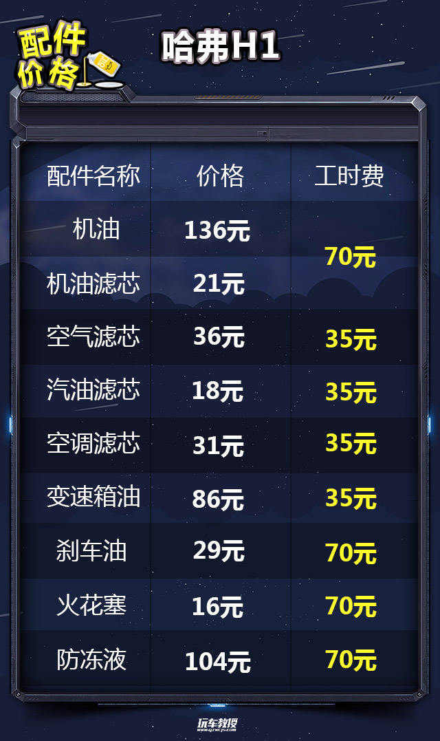 教授总结:从结果上看,小保养需要227元,这个费用算是比较实惠的了,6万公里常规保养的总费用分别为手动挡4999元,自动挡5241元,处于中等水平。在总的费用支出中,油耗占了绝大部分,哈弗H1油耗表现是比较高的。手动挡车型年花费17316元,月花费1443元;自动挡(AMT)年花费18328元,月花费1527元,综合花费表现正常。