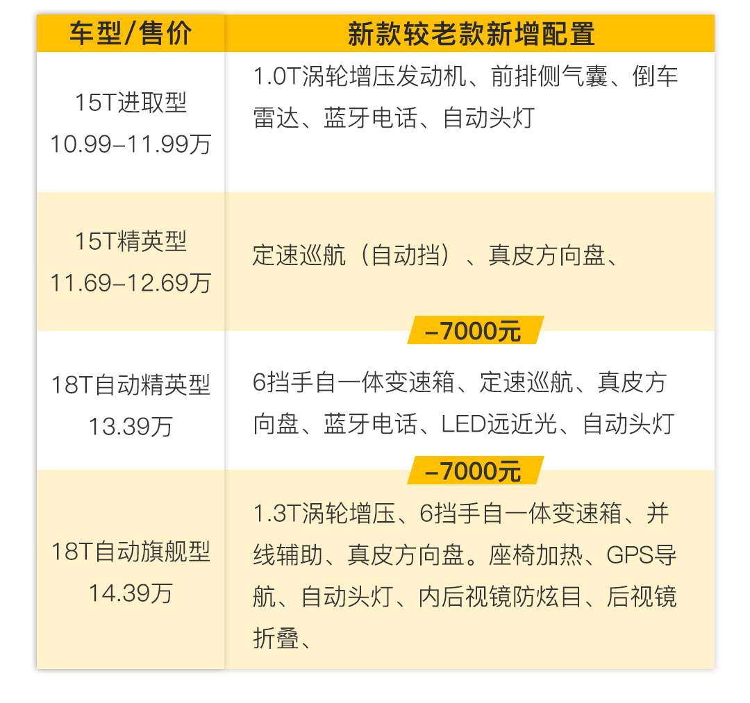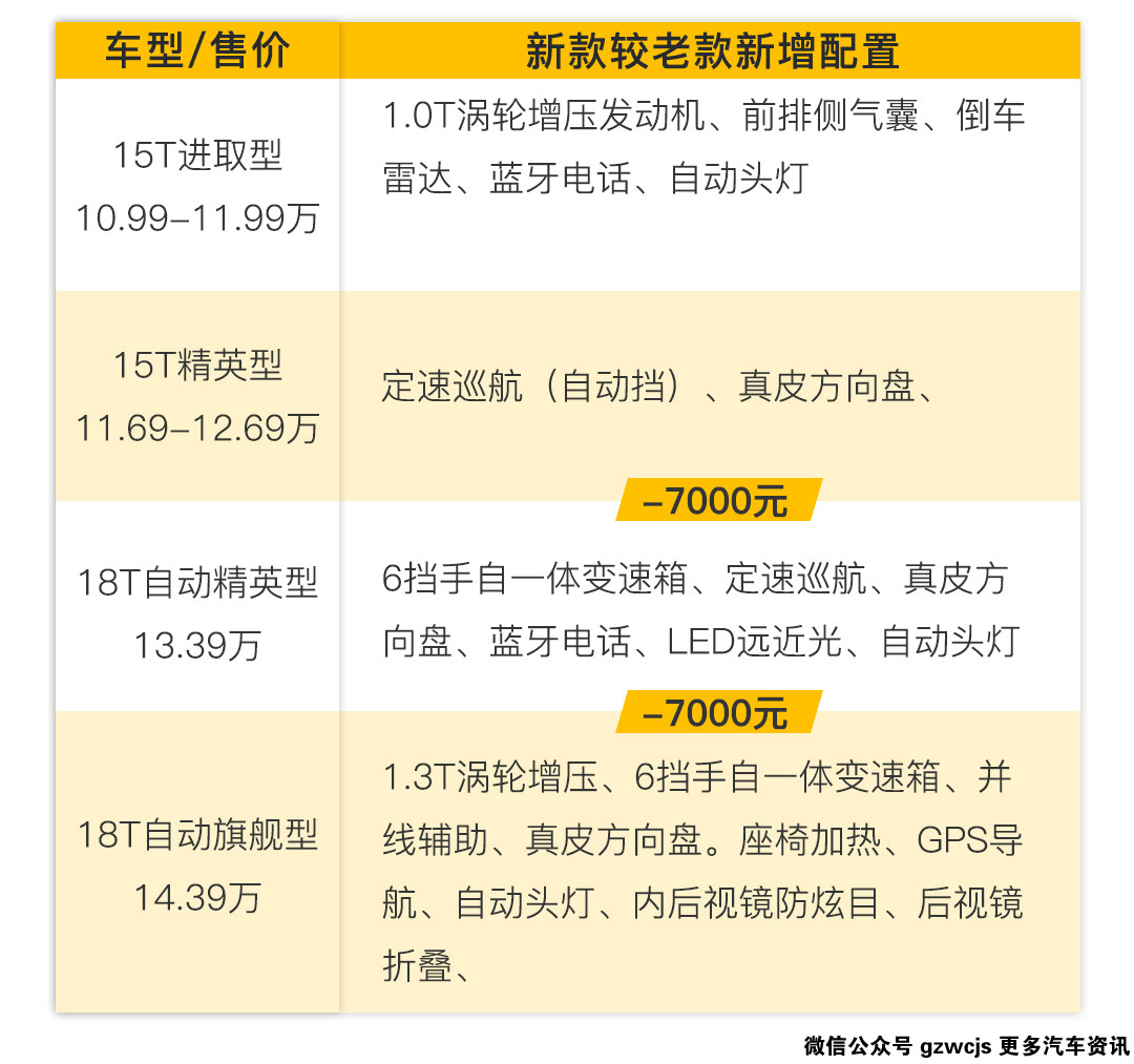 除此以外,新车也搭载1.0T涡轮增压发动机和1.3T涡轮增压发动来替换1.4t涡轮增压和1.5L自然吸气发动机。