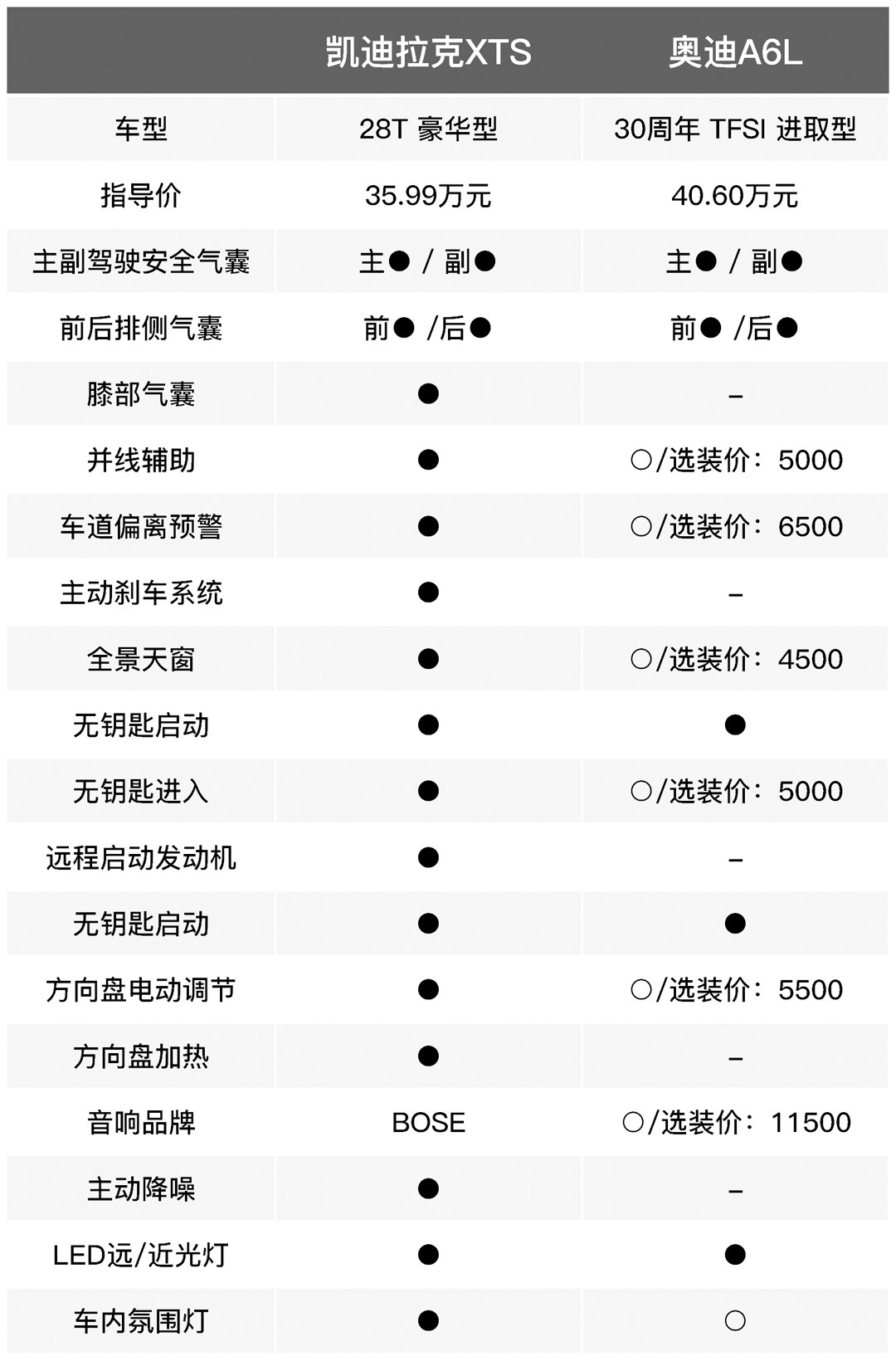 全系标配多项豪华配置,例如同级罕见的BOSE音响和主动降噪功能;Ultra-View全景天窗、多功能真皮方向盘、LED远近光灯等配置,性价比超高;拿奥迪A6L对比会发生什么?指导价最接近凯迪拉克XTS的30周年 TFSI 进取型,即使不计算终端优惠,配置和价格的对比一目了然。