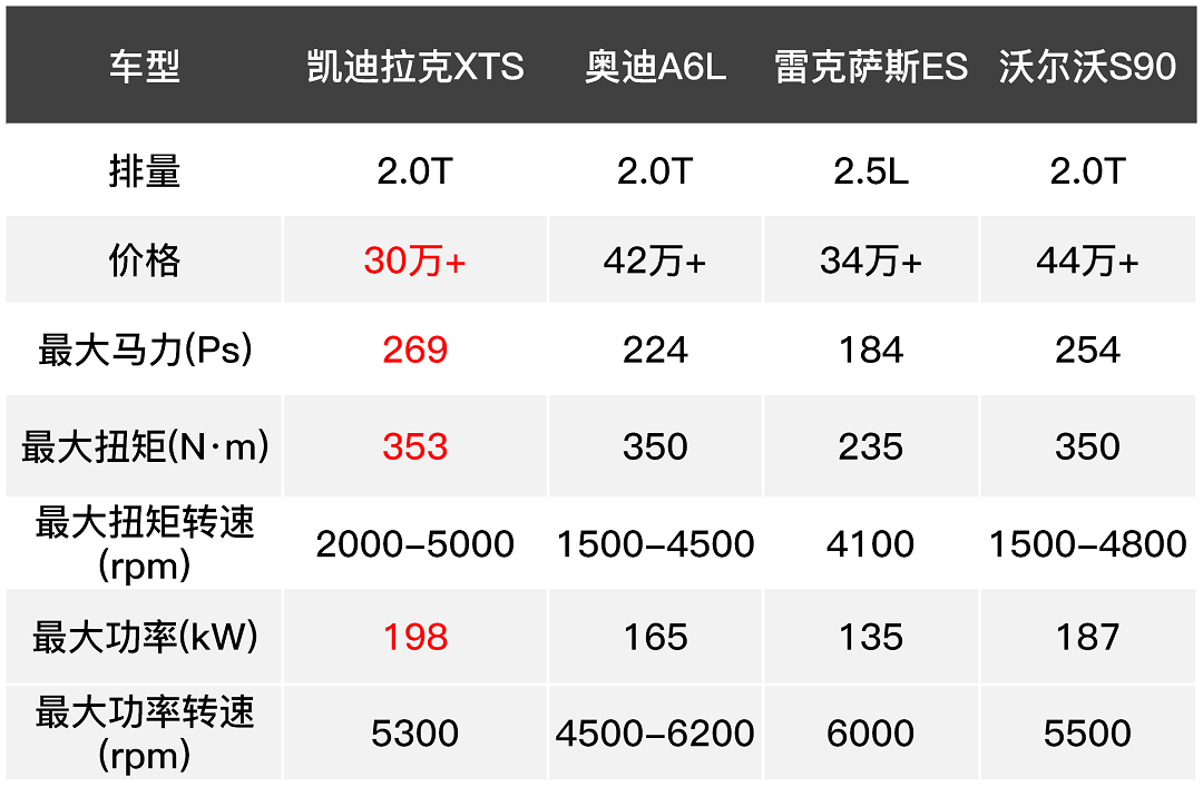 同级的的竞品表现如何?三驾马车之一的奥迪A6L动力要44万以上的3.0T低功率车型才勉强比XTS要强一点点,而大马力并不符合专注舒适性的雷克萨斯ES的性格,就连沃尔沃的高功率版本也只有254马力,用绝对性优势来形容凯迪拉克XTS应该不算过分吧?