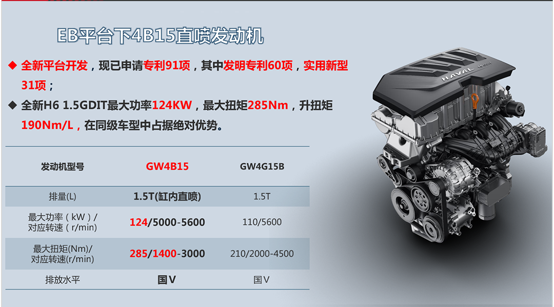 这副全新的1.5 GDIT发动机拥有1.5L排量,采用涡轮增压的进气方式,并且搭载了缸内直喷技术。发动机的代号为GW4B15,是老款哈弗H6搭载的GW4G15T的换代产品。