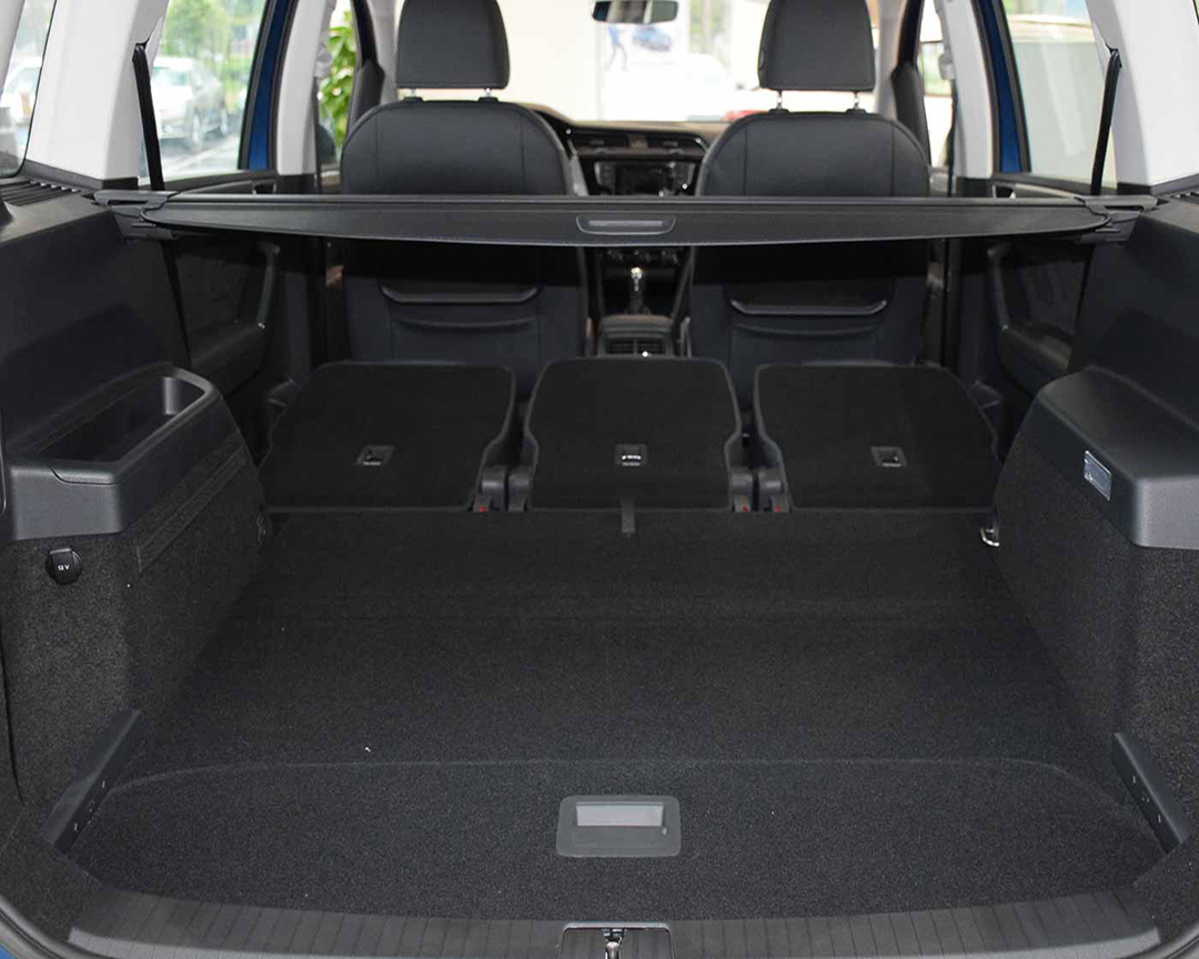 后备箱方面,作为一台搭载全家出行的MPV,后备箱的空间尤其重要。途安后备箱放下第二排座椅后能够完全放平。放下第三排座椅后后备箱空间为深度970mm,宽度1040mm高度850mm,并且后备箱带有12V电源借口,固定绳和挂钩,拓展更丰富。7座车型没有备胎,但是会配备补胎液,同时,途安还配备电动尾门,很显档次。