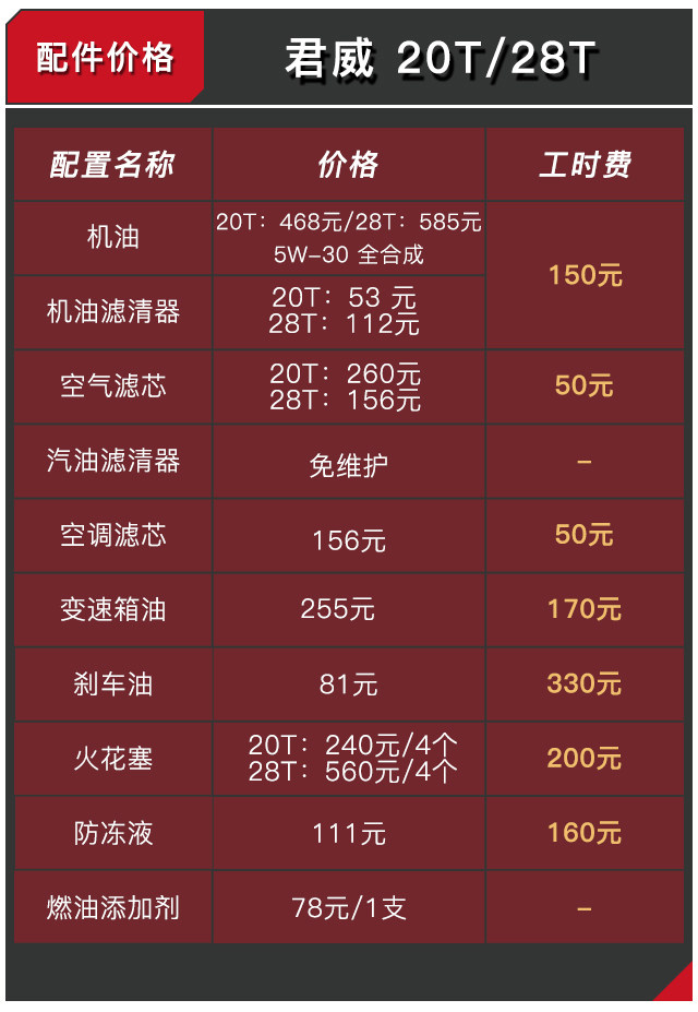 别克君威有20T和28T车型可选,配件价格、油耗等数据不一,本文将分开对比。