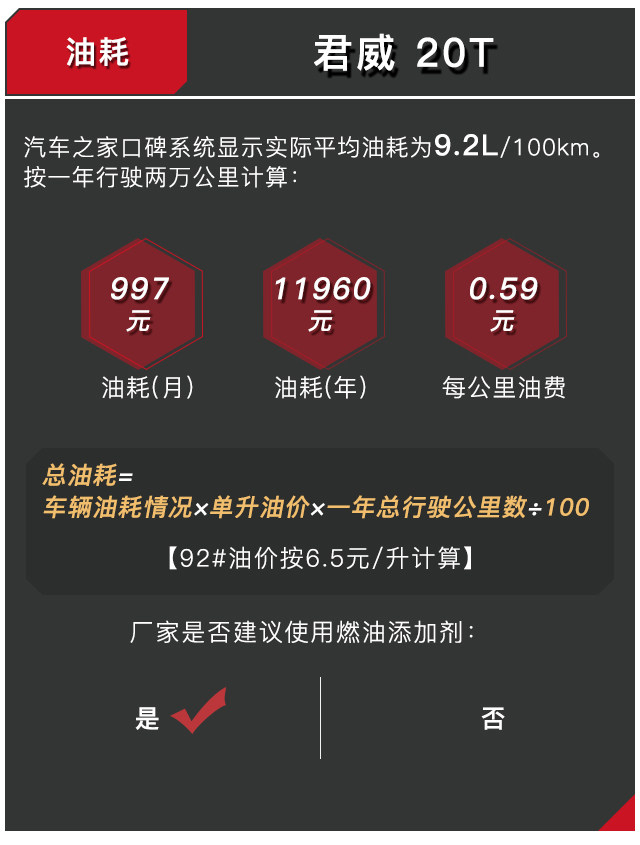 20T车型使用92号汽油,按一年行驶2万公里计算,则2万公里总油耗费用为11960元,推算出每个月油耗费用约为997元。