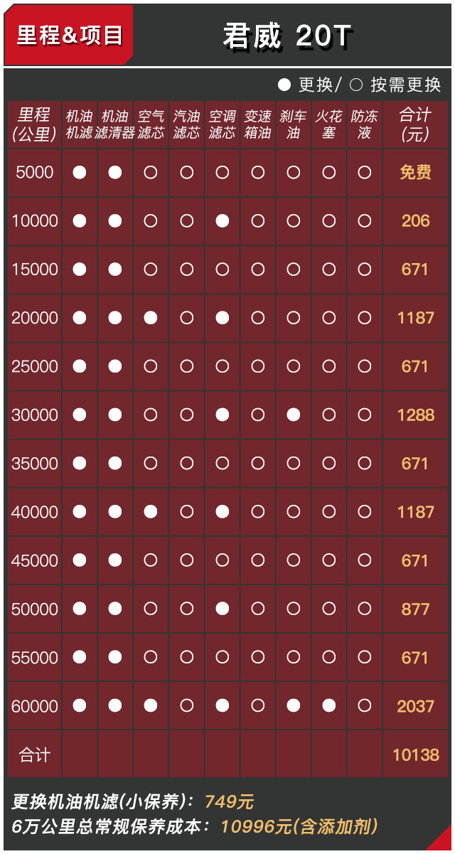 28T车型的保养周期和项目和20T是一样的,5000公里一保,6万公里差不多1万二花费,只比20T车型多两千,差距不大。