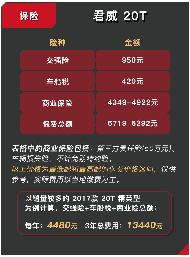 【注:本文数据仅供参考,油价取广东地区油价计算;油耗计算方法:平均油耗×油价÷100=每公里油耗,再按照一年两万公里使用算出一年总费用,再推算出月均油耗花费;表格中的商业保险包括第三者责任险(50万元)、车辆损失险、不计免赔特约险,实际费用以当地缴费为准;数据来源汽车之家】