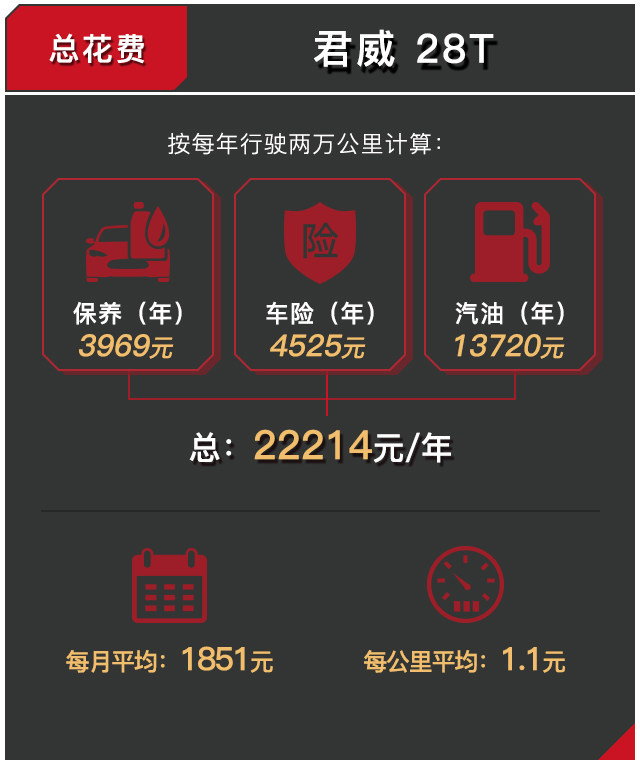 小结:君威28T车型保养、车型、油耗均比20T多出一点点,总费用2万2左右,差距两千块钱,看来两个排量养车费用差不多,教授觉得动力更足的28T会好一点。