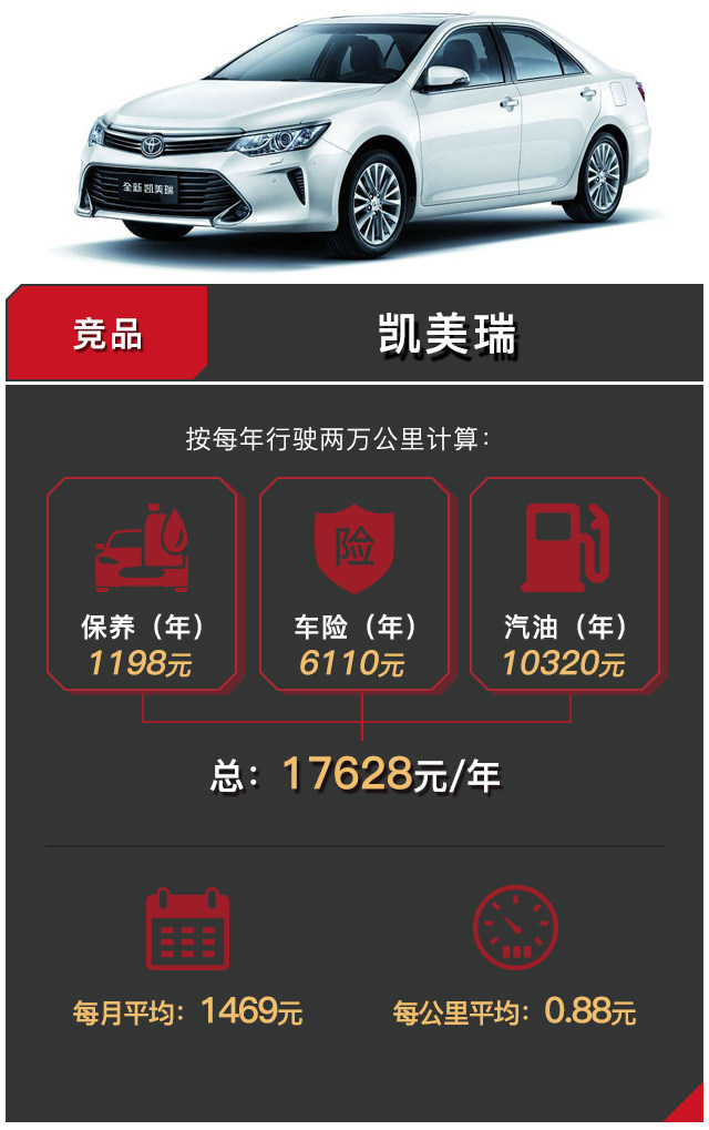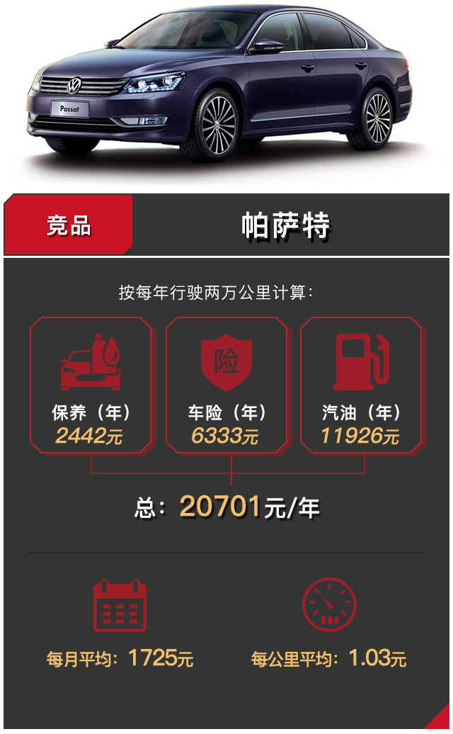 与君威对比的凯美瑞和帕萨特保养开销为平均数值,凯美瑞2.0L和2.5L的保养花费相差不大,凯美瑞的油耗表现比较理想,两种排量的油耗水平都在8升左右,保养方面价格都不高,而且送三次保养,所以总体开销是比较实惠的;而帕萨特取折中的1.8T车型,油耗和保养费用不如凯美瑞理想,但也算是中规中矩。