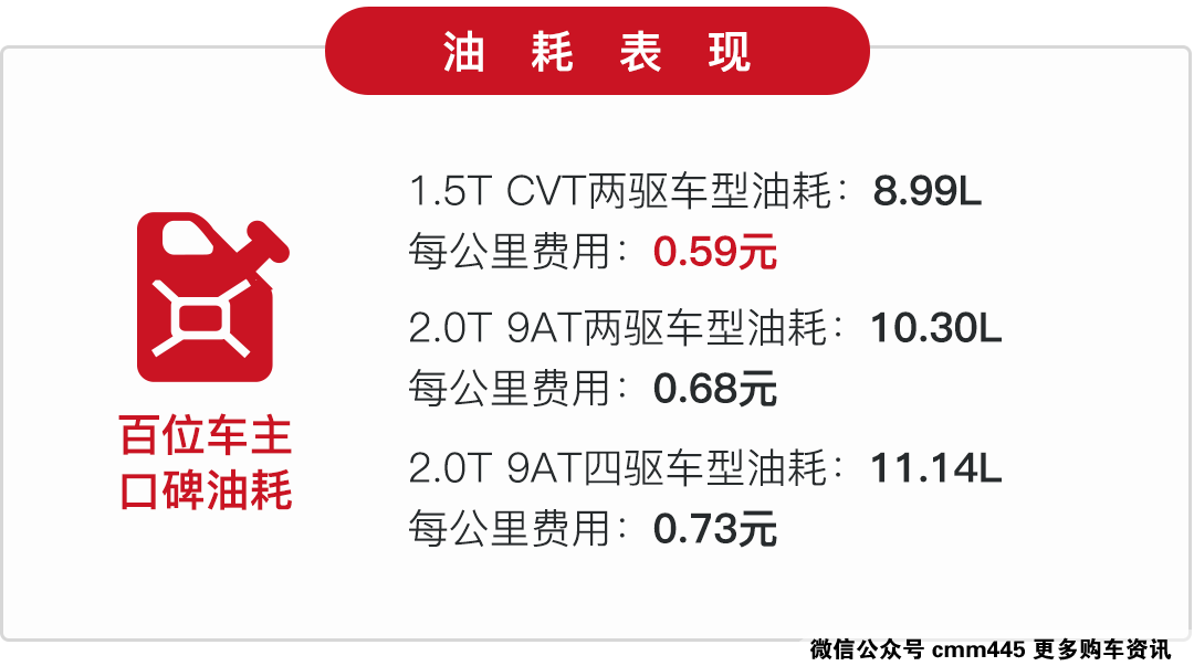 虽然1.5T车型的整备质量去到了1734kg和1755kg,但是全系采用缸内直喷技术且配上了CVT变速箱,能较为容易找到一个经济转速匹配当前的时速。而2.0T车型的油耗就不太乐观了,整备质量为1804kg到1876kg,同时9AT变速箱的匹配也不太完善。