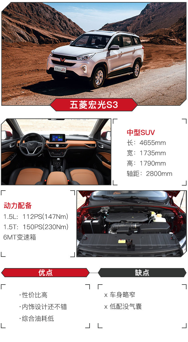 目前市面上表现比较出色的7座中型SUV是东风风光580和长安CX70,从外观看,还是东风风光580和长安CX70的设计更成熟大气,空间表现也略有优势,并且东风风光580和长安CX70都有自动挡车型,选择要比五菱宏光S3更丰富点。不过跟东风风光580和长安CX70家用的定位稍有不同,五菱宏光S3的定位是宜家宜商的7座SUV,可以看做是五菱宏光的升级版,优势是更低的价格和更高的性价比,还有五菱宏光累积下的口碑,毕竟也是一代神车。