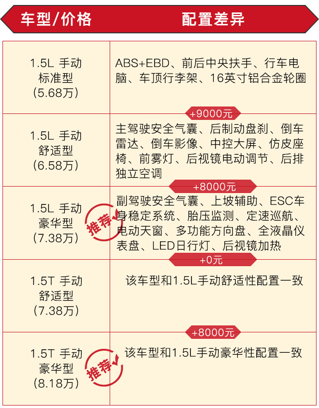 五菱宏光S3标准型5.68万的起售价比较低,但配置也确实很简陋,连主副驾驶安全气囊都没有,加了9000元的舒适型配置相对丰富了一点,加入了倒车影像、中控大屏、仿皮座椅这些看起来比较有面子的配置,后制动也换成了盘刹,不过安全配置方面只加入了一个主驾驶安全气囊还是不够。再看下顶配的豪华型,比舒适型多了副驾驶安全气囊、ESC车身稳定系统、胎压监测、上坡辅助、定速巡航、电动天窗、多功能方向盘和液晶仪表盘等等,价格只加了8000元,而且豪华型的后悬是多连杆独立悬挂,丰富了很多,所以,豪华型是比较好的选择。