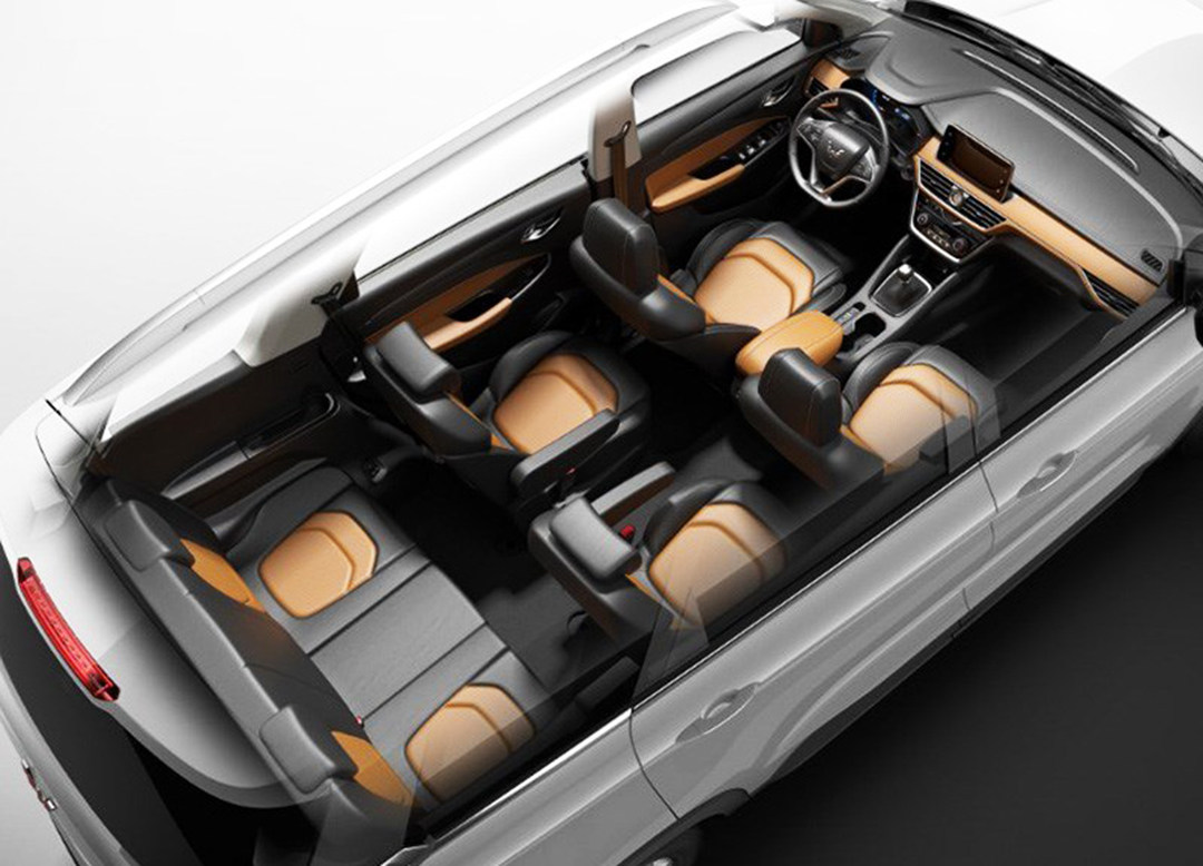 从全景图可以看到,五菱宏光S3的7座布局采用2+2+3的形式,这种布局方式的好处就在于方便了第三排乘客的进入,相对于同级别车型采用2+3+2的形式更为好一些。