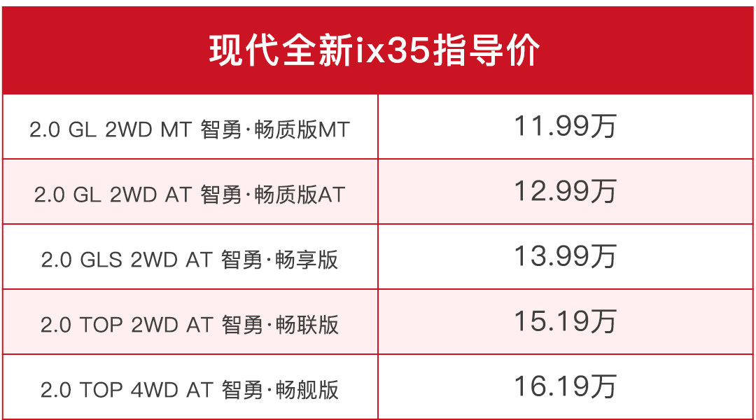 这次全新ix35一共推出5款车型,当11.99万元的起步价公布时相信吓到了不少熟悉这款紧凑SUV的消费者。作为一款生命历程超过7年的紧凑SUV车型,它已经足够成功,在换代之际低价入市是用这样一款在市场拥有良好口碑的车型给陷入困局的现代带来新动力。