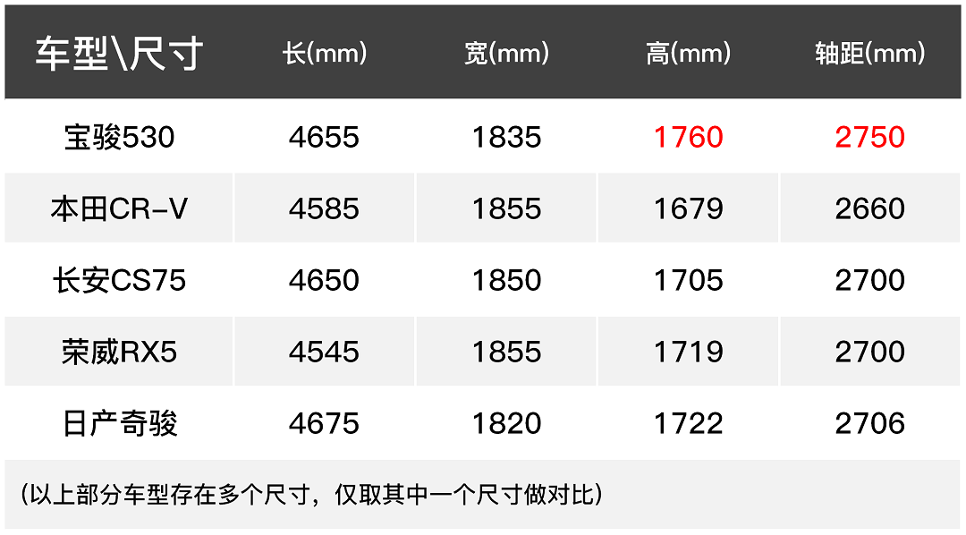 车身尺寸,宝骏530的车身尺寸为4655*1835*1760mm,轴距为2750mm,与同为紧凑型SUV的长安CS75、荣威RX5、本田CR-V相比,宝骏530的长宽高与主流车型不相上下,而轴距优势则非常明显,预想乘坐空间会是一大亮点。