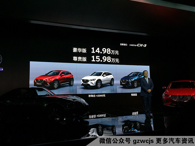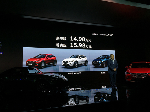 在本届广州车展上,马自达CX-3车型在国内正式上市,新车共推出2款不同配置的车型,售价分别为14.98万元和15.98万元。此外,据官方表示,其红色车型以及白色车型在购买时需要额外加2000元。据悉,先期销售的马自达CX-3都将采用进口的方式在长安马自达4S店进行销售。