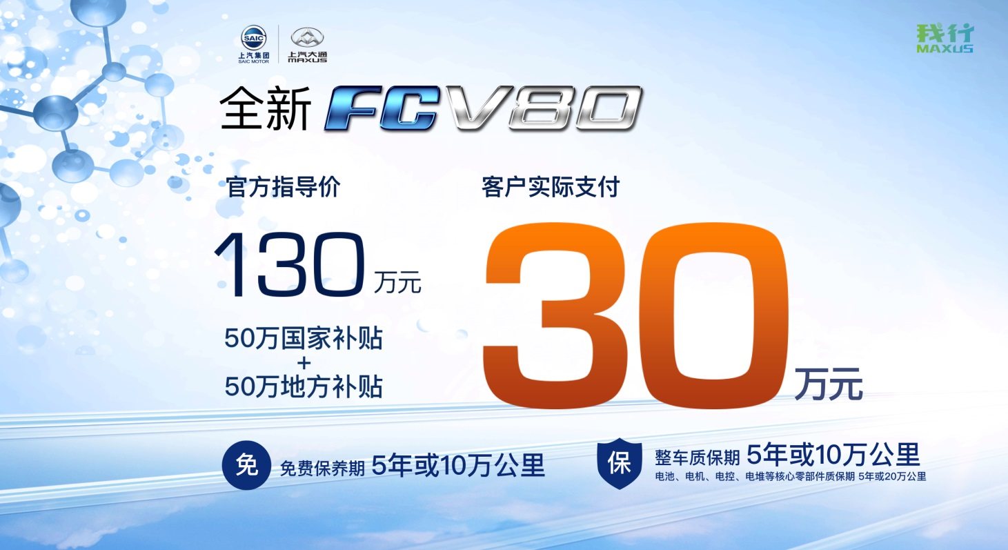 难道就不能一边享受便捷,一边呼吸新鲜空气?上汽大通想说,拒绝油腻,我们是认真的!第十五届广州国际汽车展览会上,上汽大通凭借前瞻科技再次搞事情,举行了以“智科技 致生活”为主题的发布仪式,宣布中国首款商业化运营燃料电池宽体轻客FCV80正式上市,让真正零排放、零油腻、零污染的绿色出行触手可及。FCV80售价为130万元。根据国家和地方补贴政策,所以实际购买价仅为30万元。