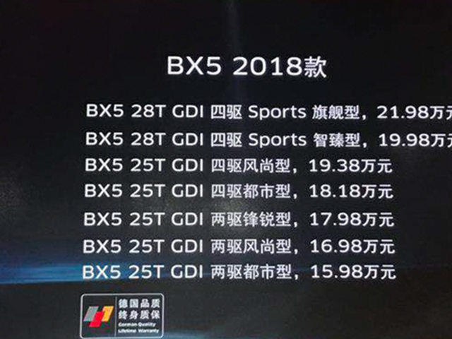 11月17日,宝沃旗下新款BX5车型正式在车展中上市,新车共提供1.8T和2.0T两种动力共7款车型,官方指导售价区间为15.98-21.98万元。本次新车重点是增加了2.0T涡轮增压车型。