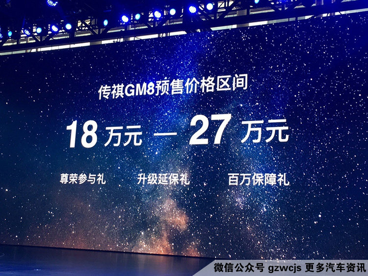 2017广州车展上,广汽传祺全新MPV传祺GM8正式亮相。新车定位为商务MPV车型,预售价18-27万元,动力方面搭载2.0T发动机。