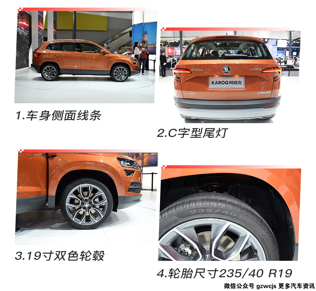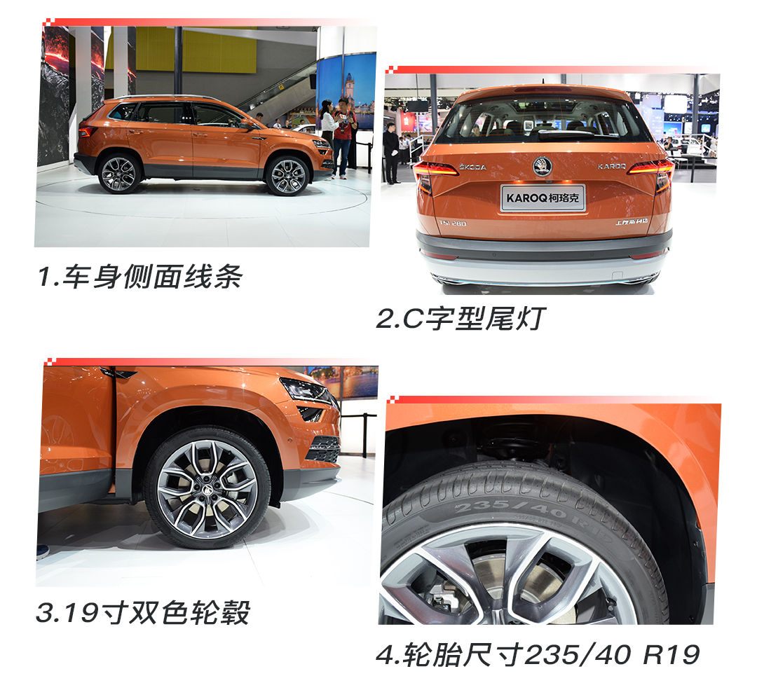 车灯部分采用分体式设计,有8条放射状的LED灯带作为日间行车灯,据说,因为捷克是著名的水晶生产国家,柯珞克的大灯组和雾灯的造型也受到传统水晶工艺启发。车身侧面则采用一根笔直线条,从车头延伸到车尾,简约而硬朗。国产车型会根据配置差异提供215/60 R16 95V、215/55 R17 94V、215/50 R18 92V三种规格的轮胎和三种轮毂样式选择。