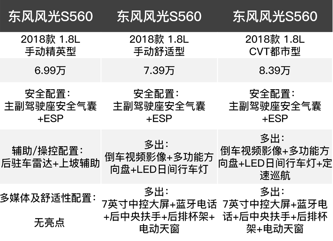 你看次低配虽然贵了4千元,但是多出的一大堆配置足够突显高性价比。如果你想入手CVT车型的话,售价8.39万的1.8LCVT都市型也是高性价比之选。