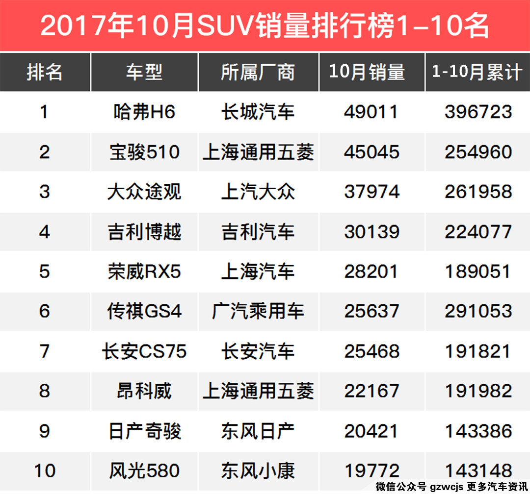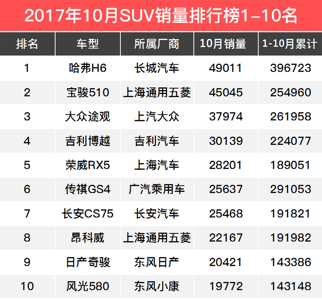 从9月到10月,TOP3还是那铁打的销量冠军哈弗H6,夺冠再次失败的宝骏510,保持第三的大众途观,其中途观销量比起9月上升5000辆这样,把排名8、9的竞争对手昂科威和奇骏甩得远远的,CR-V和途胜也已经被挤出前十;而传祺GS4销量下降排名掉至第6,荣威RX5力争上游排名第5。