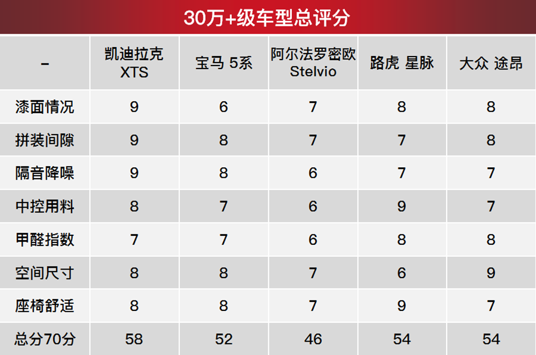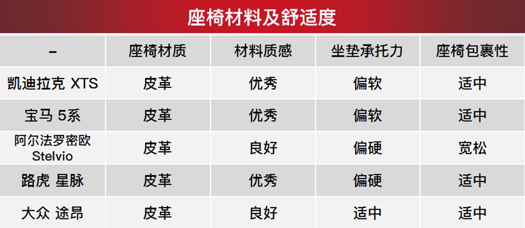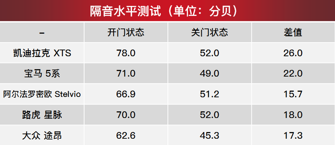 不难发现,在本次静态体验当中,凯迪拉克XTS、宝马5系的隔音降噪水平属于第一梯队,路虎星脉、大众途昂紧随其后,阿尔法罗密欧Stelvio则依旧表现出不拘小节、浪漫不羁的个性。