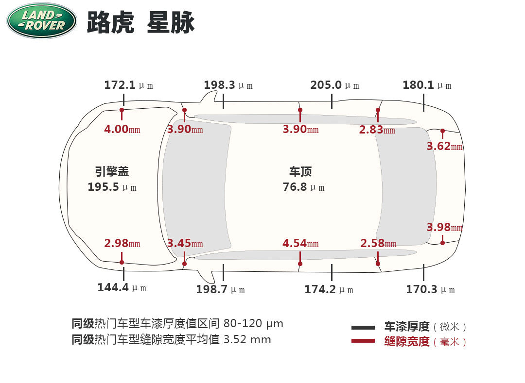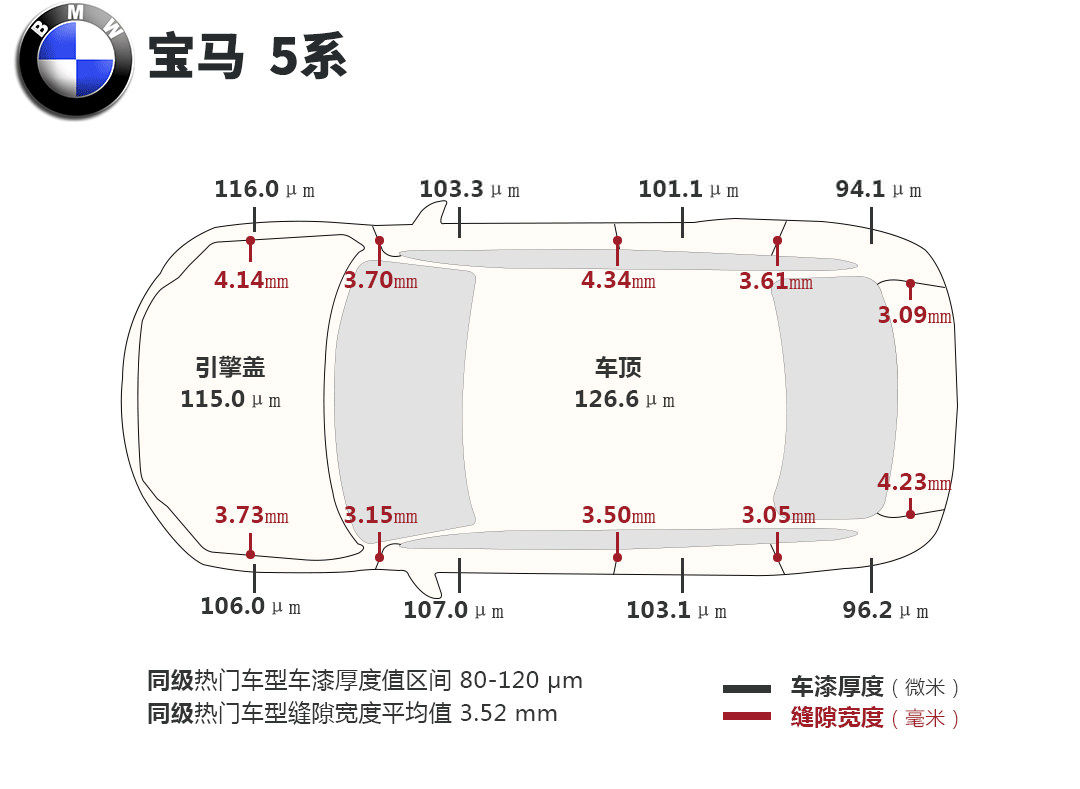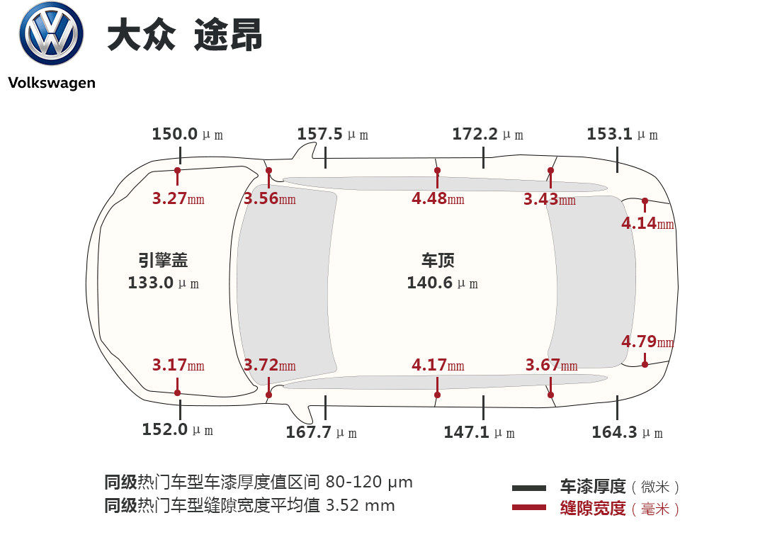 多数知名品牌汽车,车漆膜厚度一般是在120-180μm之间,车顶、引擎盖则稍有出入。一般认为,漆面厚度低于110μm就稍显不厚道,个别豪车甚至达到200μm以上。当然,也与漆面材质有关。