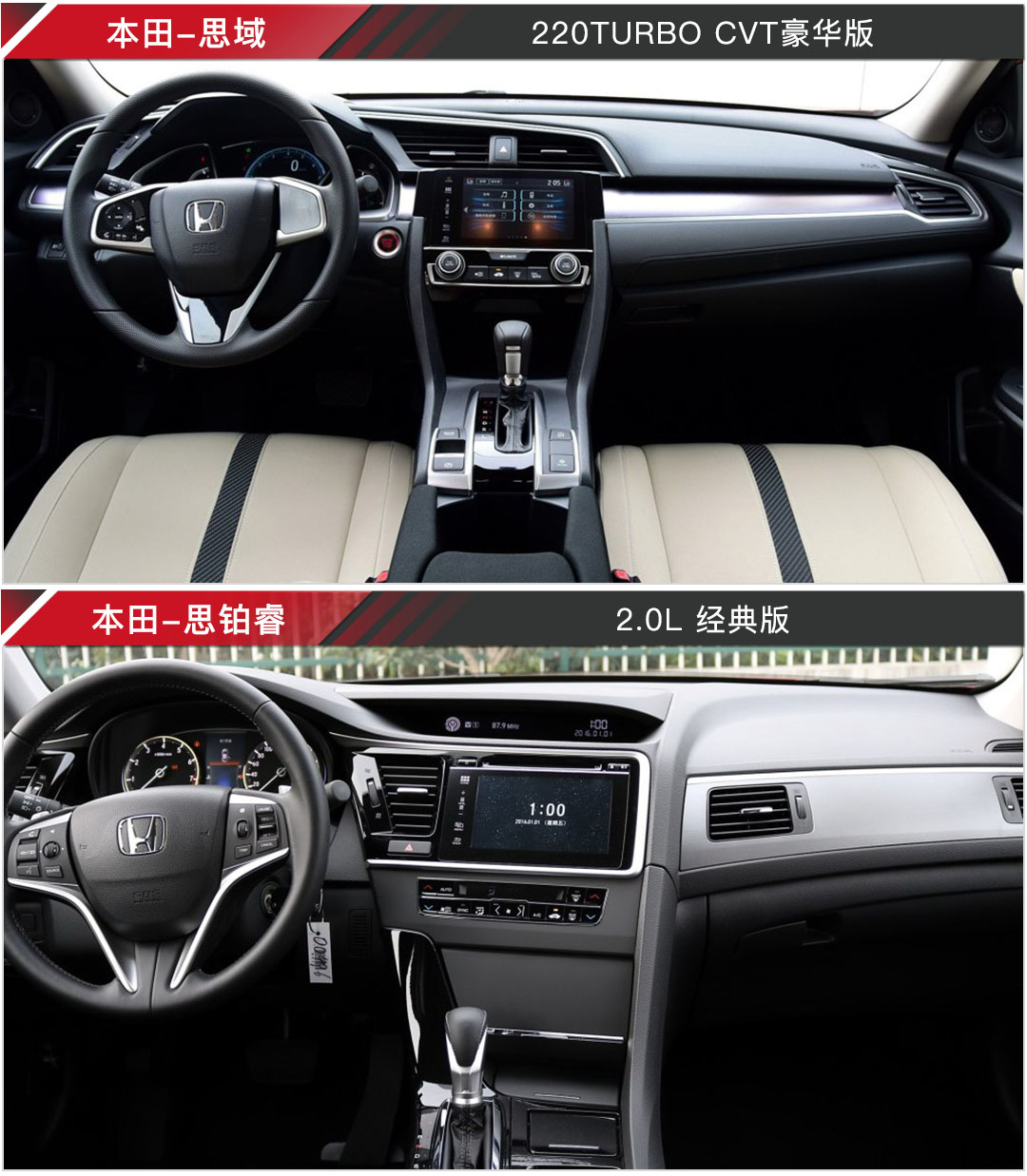 两车内饰风格最大的差异在于思域追求的是对称美,而思铂睿的内饰设计则更偏向驾驶者,在设计上虽然我也是会更喜欢思域的风格,可是对于做工用料,思铂睿却更胜一层楼,比如思铂睿的一些储物格会用绒布包裹,比如中控区大面积钢琴漆面材质的运用,皮质方向盘等,都能体现出其高级感。
