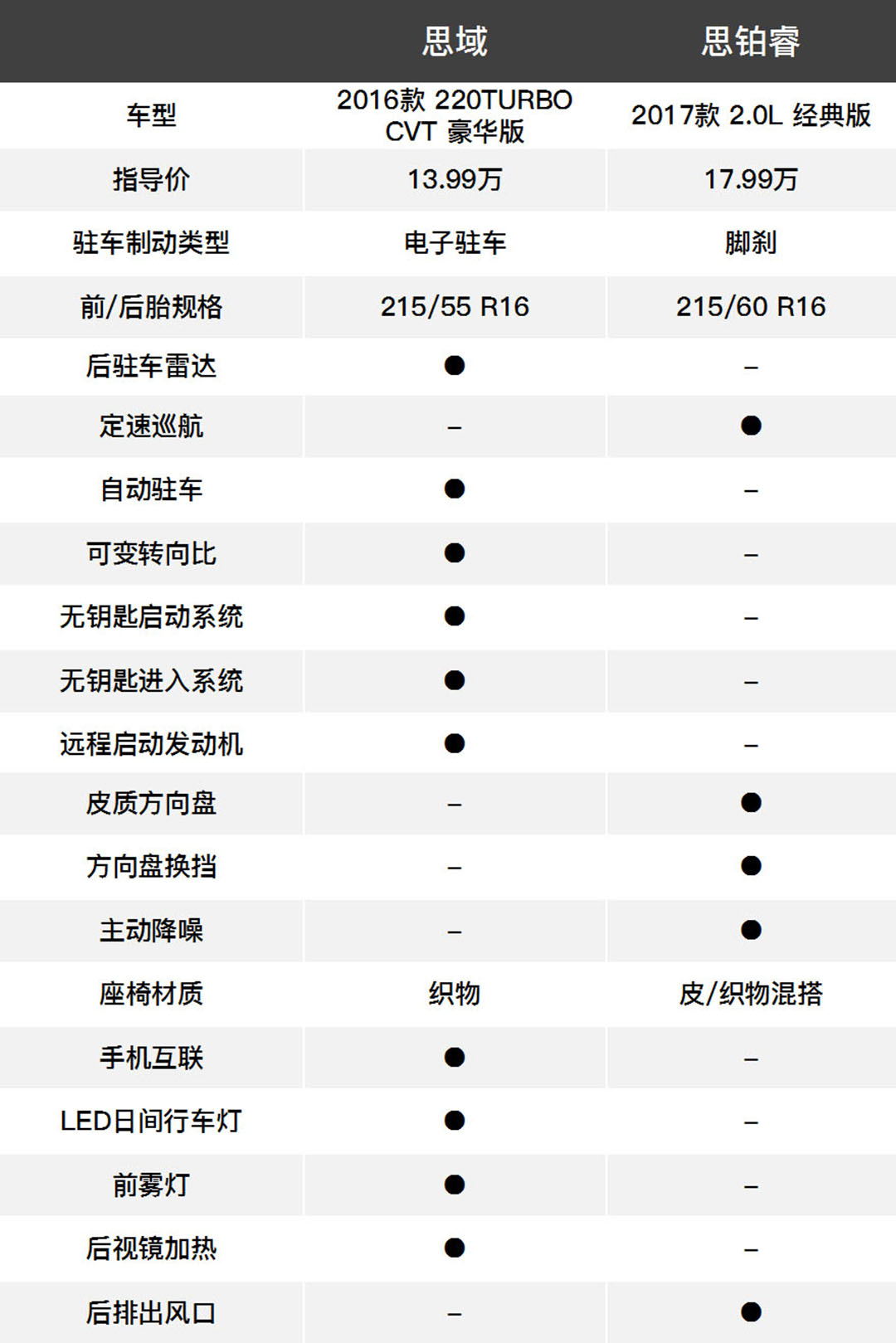 看完这些动力参数后,也许有不少思铂睿的车主已经哭晕在厕所,“老子花了更多的钱,都买了什么鬼?”可是思铂睿优良的转向系统和底盘调校是要比思域的“傻快”更具驾驶乐趣的。在这里虎哥需要安抚一下这些思铂睿车主们,先不用哭,做人还是需要乐观点,我们看完配置表的对比更精彩更刺激哦。