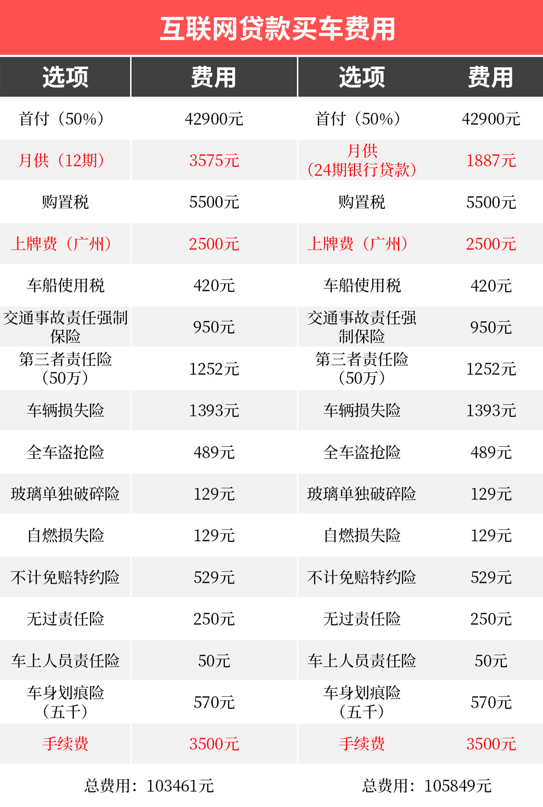 由于购车的流程是线上申请-业务员联系-线下看车-签约提车,根据不少已经在互联网上购车的消费者的反馈,不少4S店仍然需要缴纳高额的手续费以及上牌费用,所以我们暂时以上牌费2500元和手续费3500元作为参考计算。同时,在跟销售交流的时候得知,在4S店里面也存在一些低首付的金融政策,实际上也就是背后的互联网公司,所以在4S店购车的消费者也需要注意了。