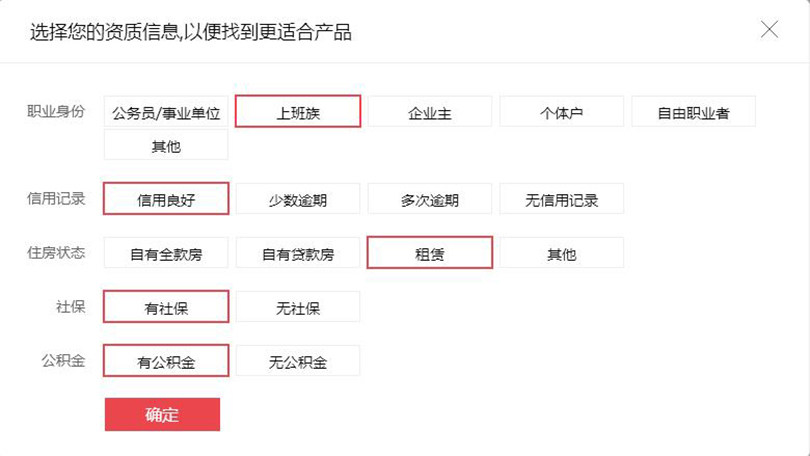 进入页面以后,我们依然选择同样配置的飞度后便会弹出几个选项,里面包括了职业身份、信用记录、住房状态、社保、公积金几个选项,相比于去银行办理贷款繁琐的手续,互联网贷款购车产品显然十分便捷。