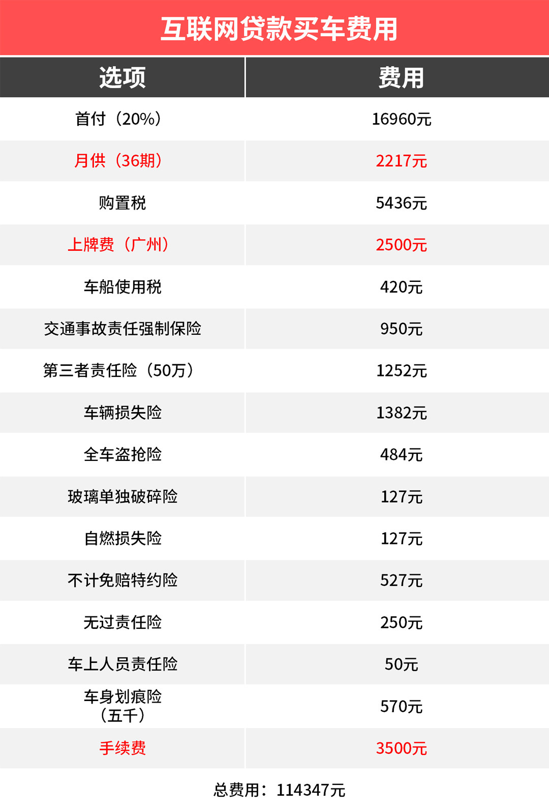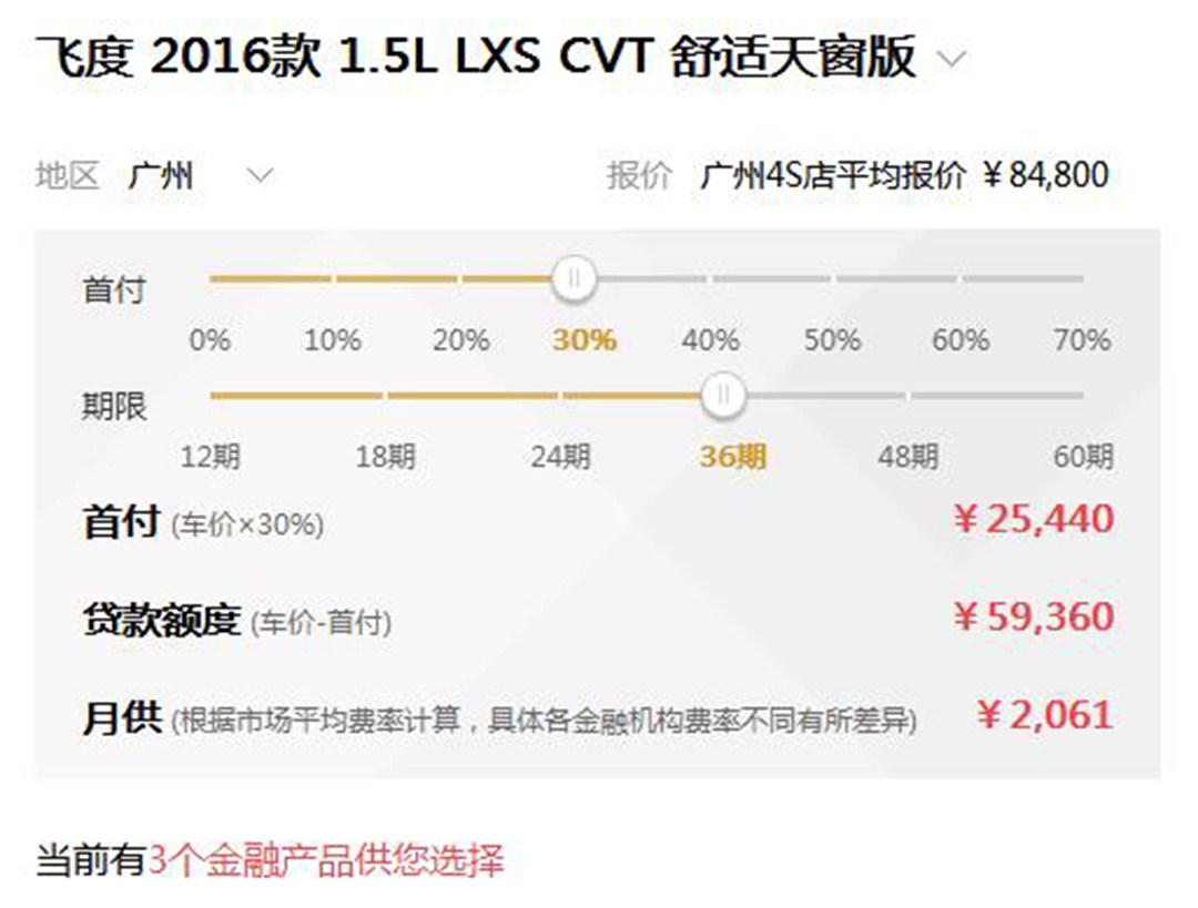 选择完以后,消费者便可以根据自己的能力选择首付和还款的期限。以广州4S店平均报价84800元,最低首付为20%(一般4S店最低首付为30%),最多分36期,也就是首付要16960元,月供为2217元,总花费为96772元。当读者看到这里的时候,会不会觉得有一定的惊喜呢?不过这仅仅是裸车的价格,并不包含必要的花费和商业保险费用。