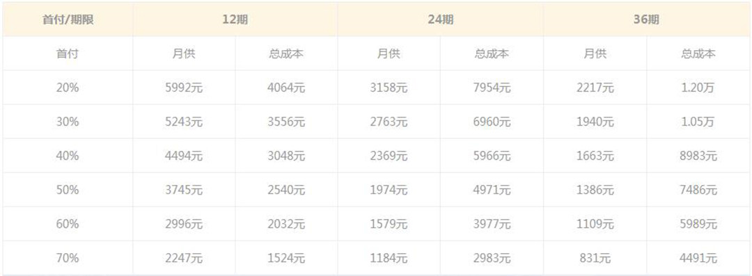 如果不知道如何选择首付以及分期的次数,互联网的公司还会贴心地为你提供详细的费用参考。