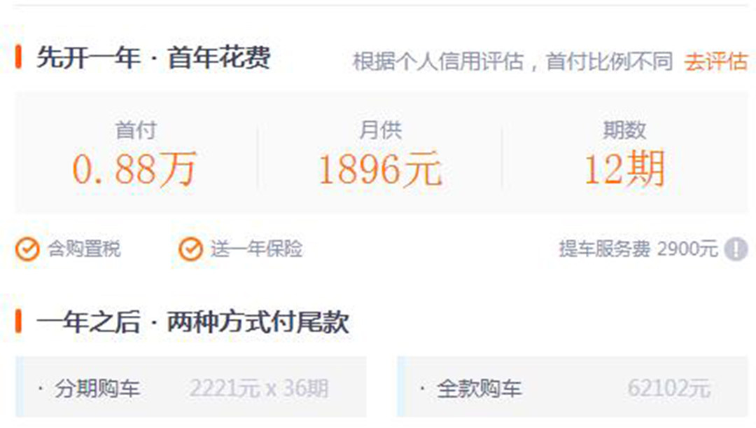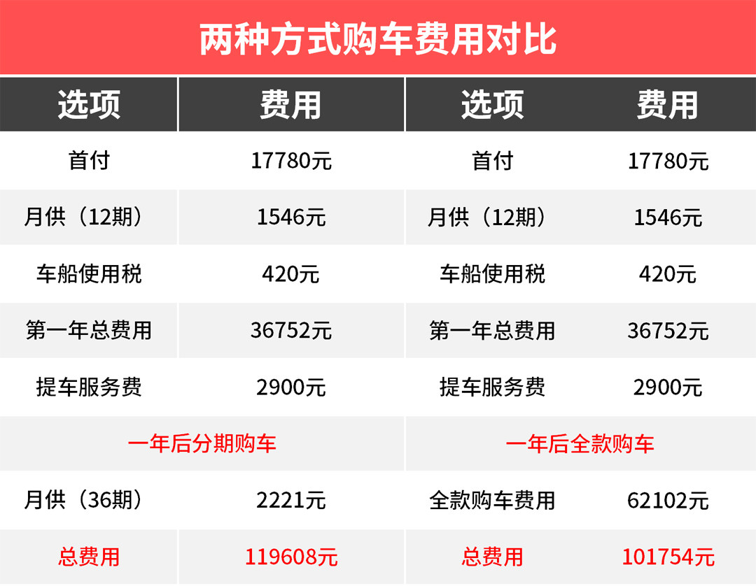 为了能够让读者更加清晰这种“先开一年,一年后两种方式付尾款”的方式,我们以第一年首付20%+一年后继续分期购车与第一年首付20%+一年后全款购车进行对比。