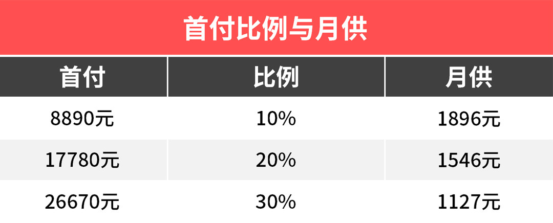 如果你需要根据自己的实际能力选择首付的比例,就需要扫他们的二维码进行一个简单的评估,评估的内容与上面第一种的方式基本相似。评估完成后,你只能在首付比例最低10%,最高30%中选择其中一种,具体的比例以及月供如下: