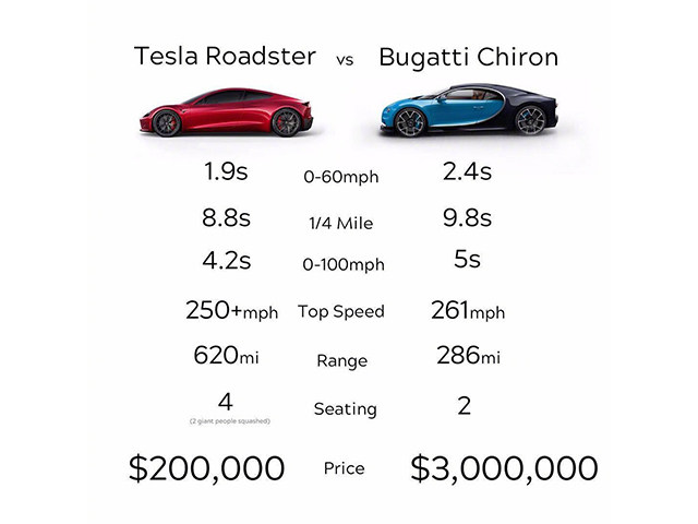 没对比就没伤害,现在拿陆地最强燃油车布加迪Chiron的数据来和Roadster对比下。这...除了极速稍胜,其他每个数据都比不过,诶,电动车的时代要来了。