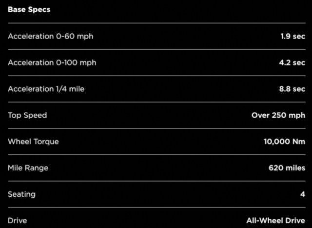 按照套路,一般是先介绍全新一代Roadster外观的,但是这次要先亮动力数据了,因为新Roadster的数据实在是太炸裂了。0到96km/h只要1.9秒,0到160km/h也仅仅4.2秒,最高时速可达400km/h,最最恐怖的是扭矩是10000N·m,你没看错,是10000,而且是轮上扭矩。看完数据我只想说,马斯克真是个疯子啊。