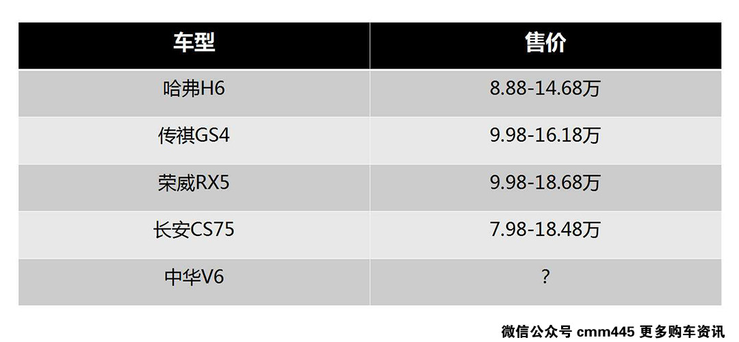 但也正是这个细分市场,哈弗H6和传祺GS4两座大山屹立在前,荣威RX5、长安CS75两员悍将虎视眈眈、甚至还有比亚迪宋之类的同级别SUV在后方摩拳擦掌,华晨中华V6要与这些车型博弈,可谓是一番恶战。