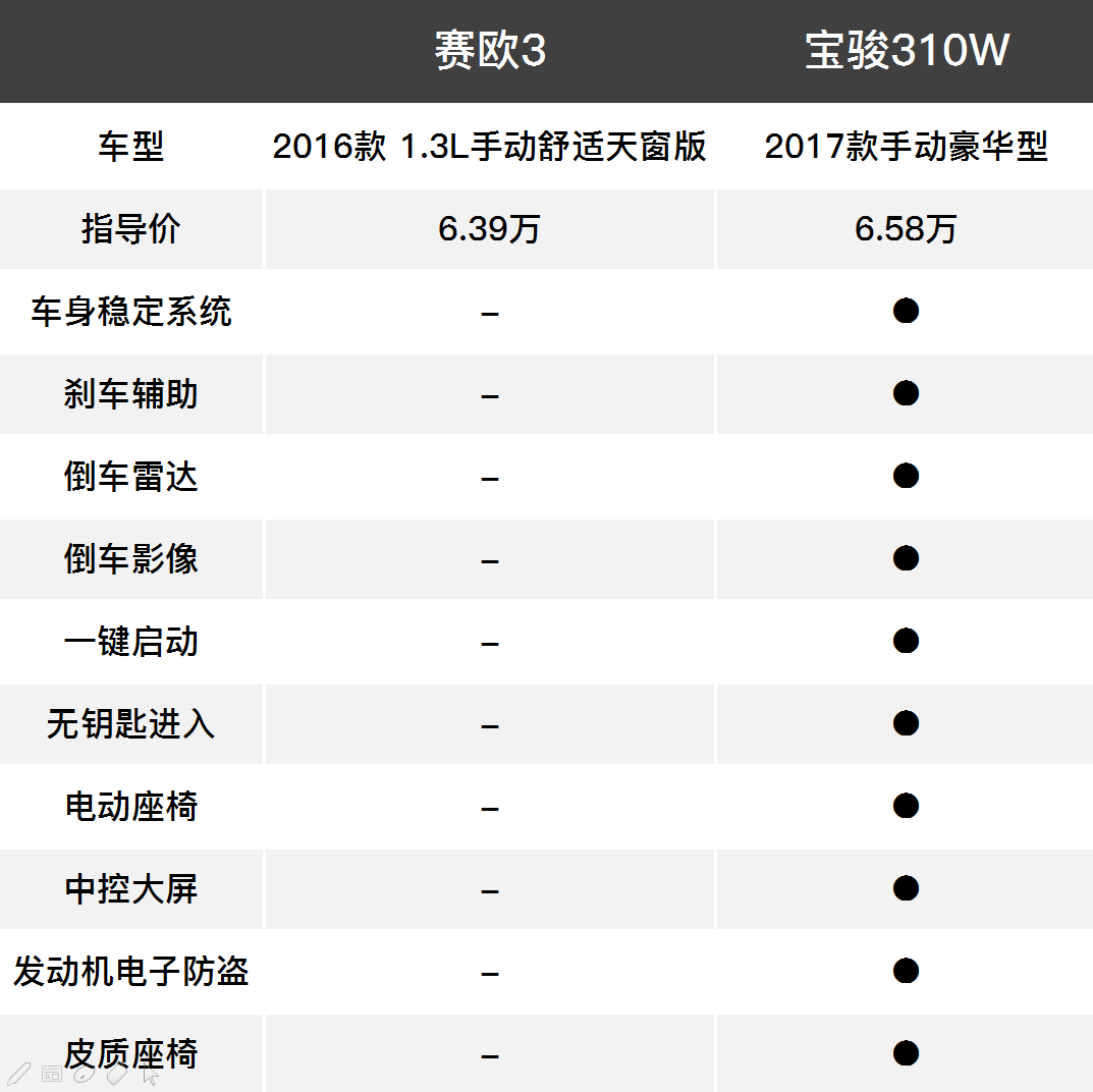 四五万的合资车不可回避的一个问题就是配置低,比如说6.39万的2016款赛欧3 1.3L手动舒适天窗版和6.58万的宝骏310W 2017款手动豪华型,赛欧3没有ESP,没有刹车辅助、没有四轮碟刹也没有倒车雷达;而310W不仅有这些装备,还有一键启动、倒车影像、发动机电子防盗、电动座椅、8英寸大屏导航和皮质座椅,而且轮胎尺寸更大、发动机规格也更高,差距真的很大。