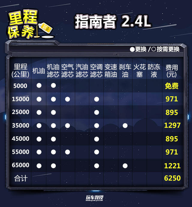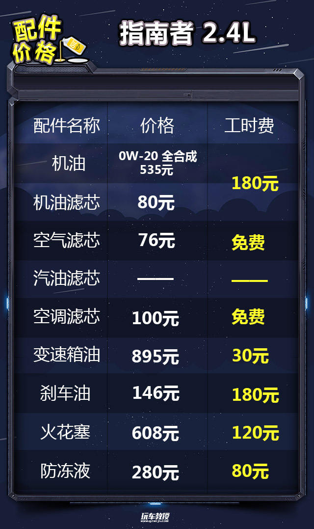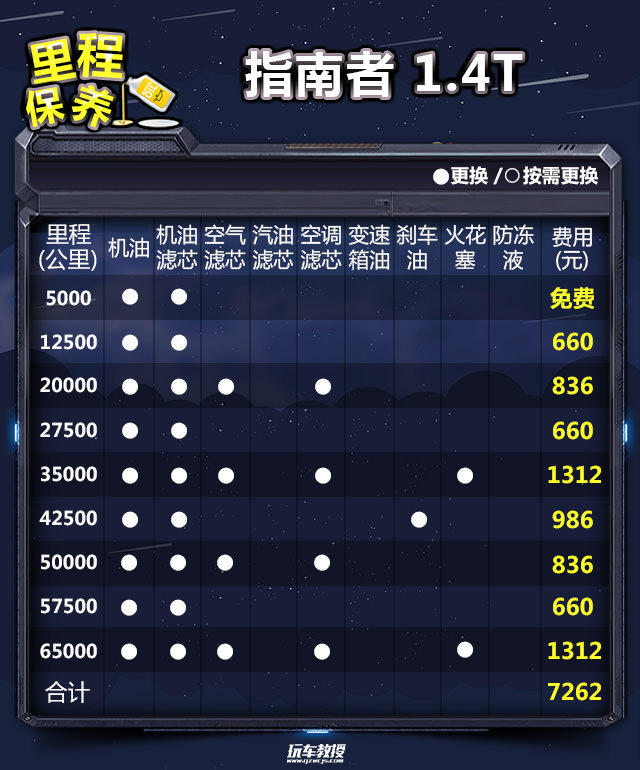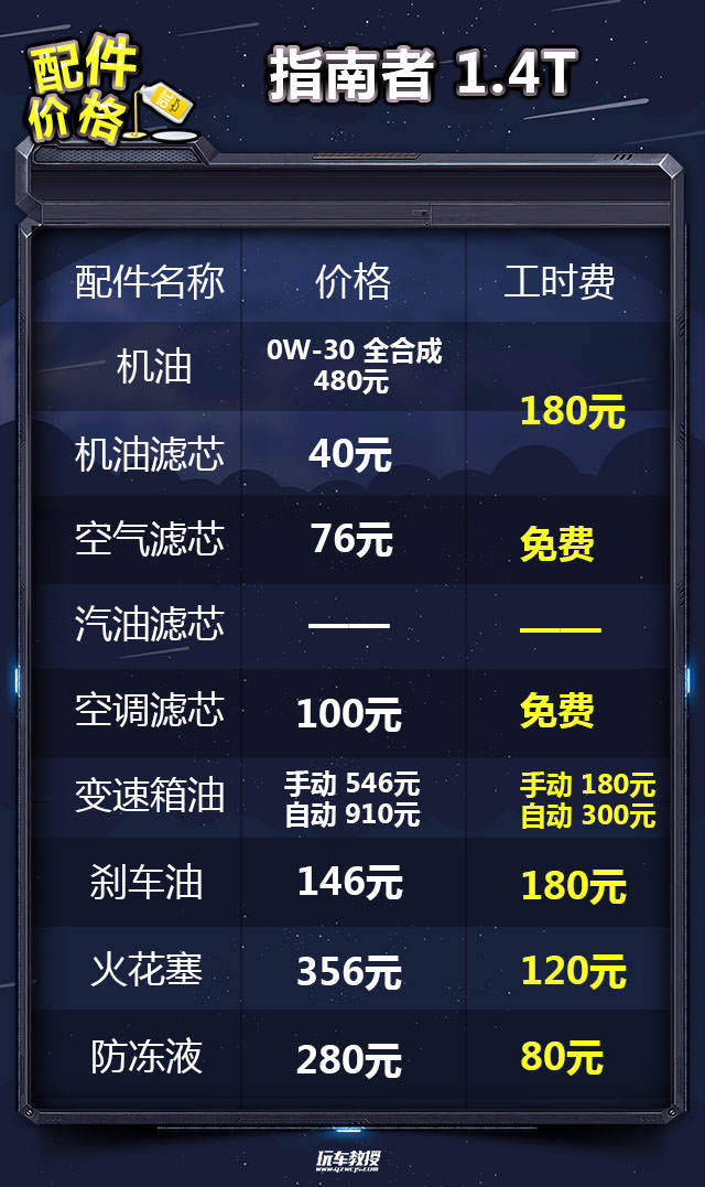 教授总结:指南者的1.4T车型和2.4L车型的保养间隔会有所不同,1.4T车型的小保养价格为660元,2.4L车型为895元。行驶6.5万公里保养总费用分别为7262元和6250元,1.4T车型的保养总费用要比2.4L车型要贵1000元,在同级别中并不算贵。以一年行驶两万公里为例,1.4T车型年花费为23107元,月花费为1926元;2.4L车型年花费为26206元,月花费为2184元。整体的养车费用适中,相比福特翼虎要低。
