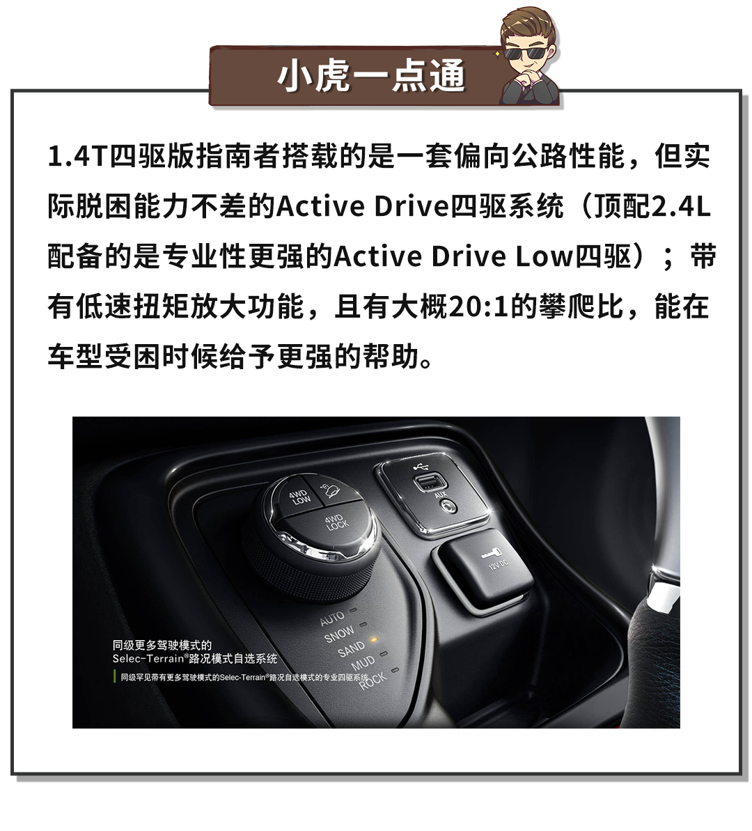 好在今年的指南者做出了欣喜的改动,推出1.4T+9AT+四驱的车型,可谓是解决了很多人的心病,虽然动力总成没变,而且四驱系统的搭载会让城市道路上的高速性能有一定的衰退,但是Jeep专业的四驱系统却可以将缺憾得以弥补。