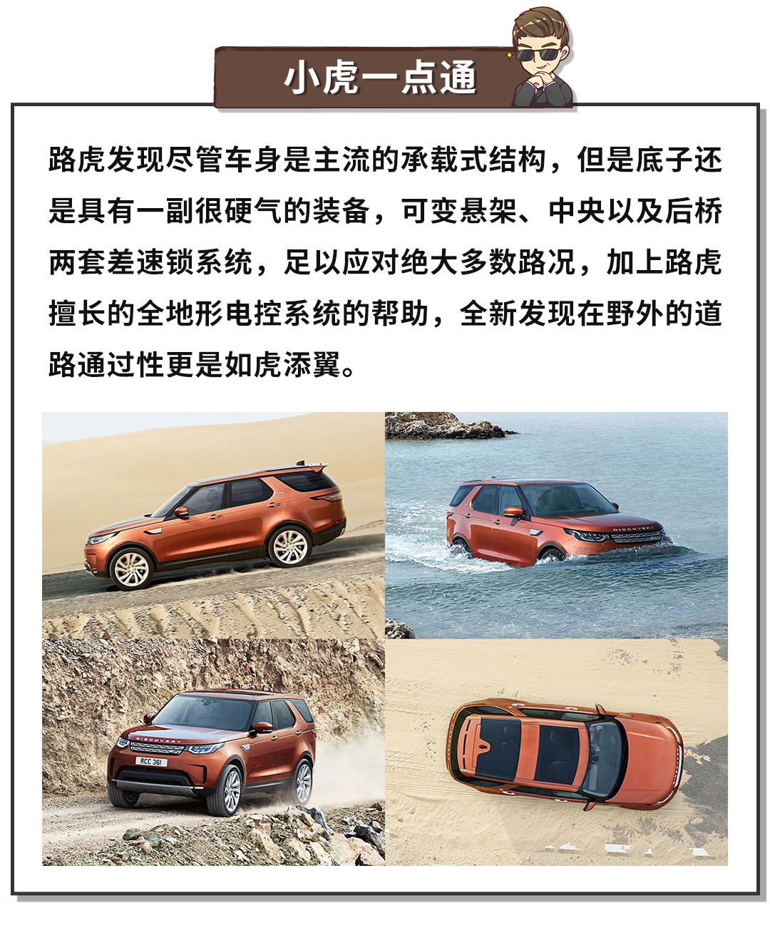 但是最新一代的发现却让不少人觉得路虎变心了,主要的原因在于它放弃了发现4的非承载式车身结构,转用更主流的城市SUV常使用的承载式车身为主要架构;但这并不代表它就“软了”;相反,在保证了强度不低的越野性能的同时,全新发现更在城市道路的舒适性表现上颇有建树,或许它是变得没那么粗野,但却是多了一分细腻与温顺,更符合主流市场诉求。