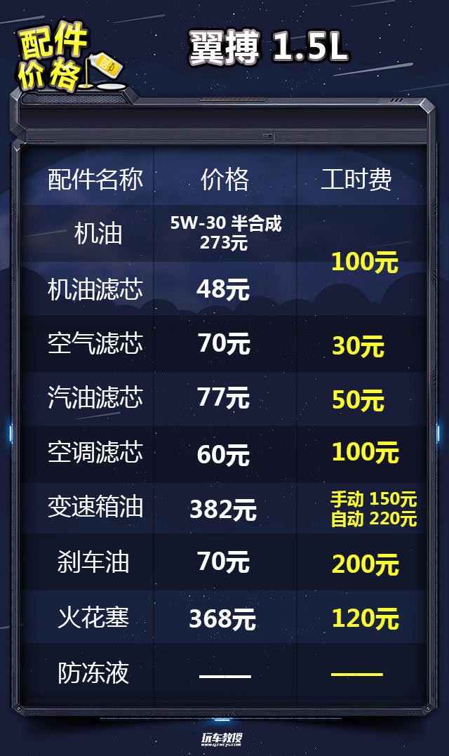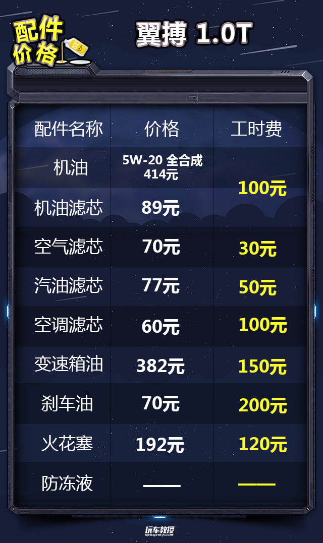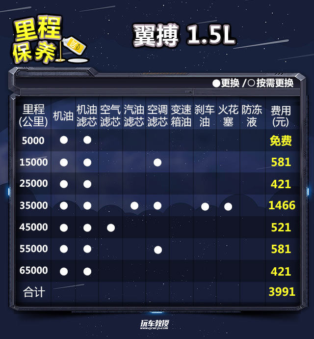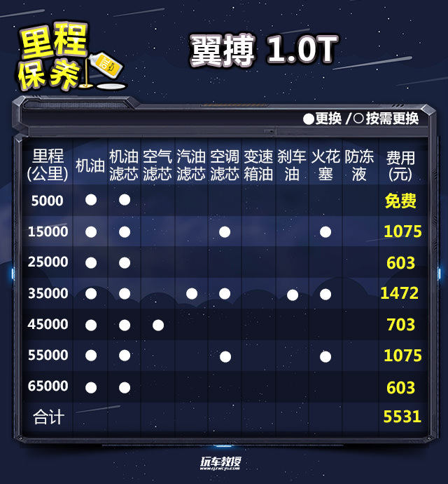 教授总结:翼搏首保里程为5000km以内,厂家建议的保养间隔为10000公里/次,但是4S店建议为5000公里一保。小保养价格为421元,行驶6万公里保养总费用为1.0T车型5531元,1.5L车型为3991元,如果按照4S店建议5000公里一保来计算,使用全合成机油的情况下,显得有点浪费了,而且费用甚至会超过万元。整体的花费方面,1.0T车型为17947元,1.5L车型为18309元,处于中等水平。