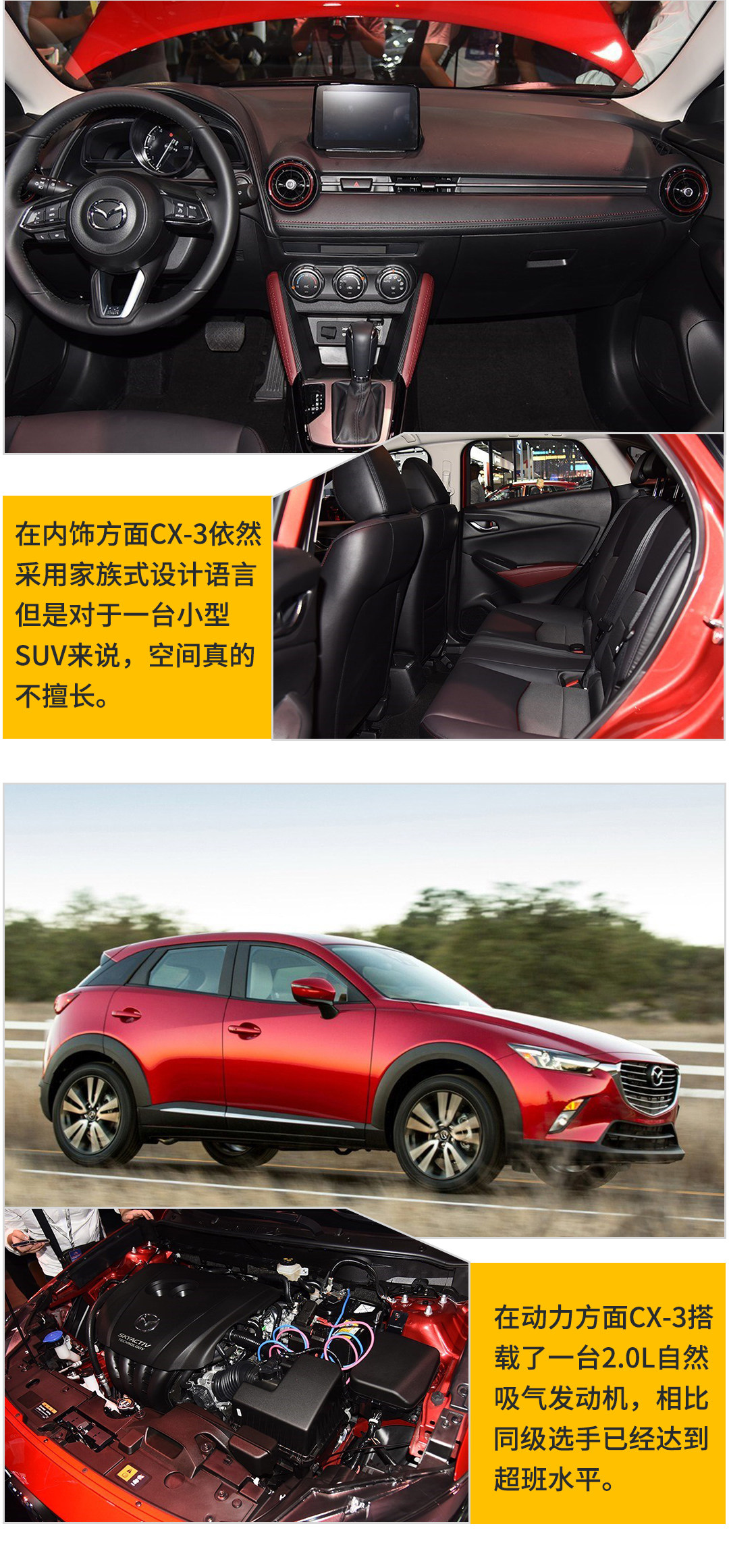 当然,马自达CX-3采用了马自达2的底盘平台,对于一款小型SUV来说,空间确实不是其擅长的,但是搭载的2.0L发动机却让它成为了一辆非常好玩而且动力十分充沛的车,小型SUV搭载2.0L,同价位也并没有多少。