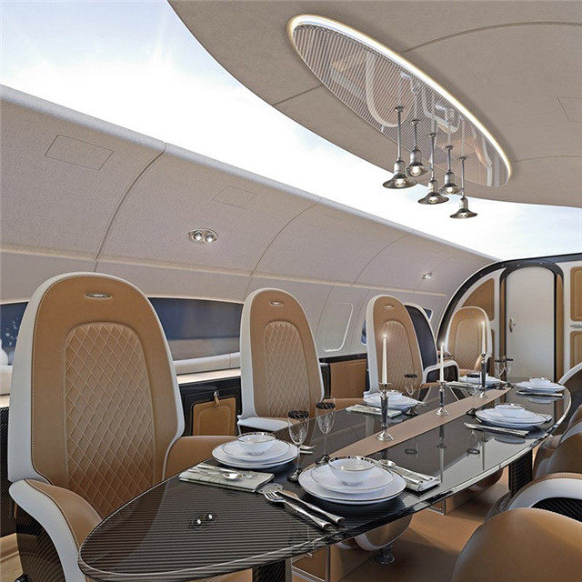 同样的,奔驰S级的高科技跟安全隐私性的特点也被引入到这个机舱中,飞机的窗户被黑色的面板覆盖,能够一键变换透明跟全黑,而且还融入了智能显示系统,能够实时显示客户所需的信息。