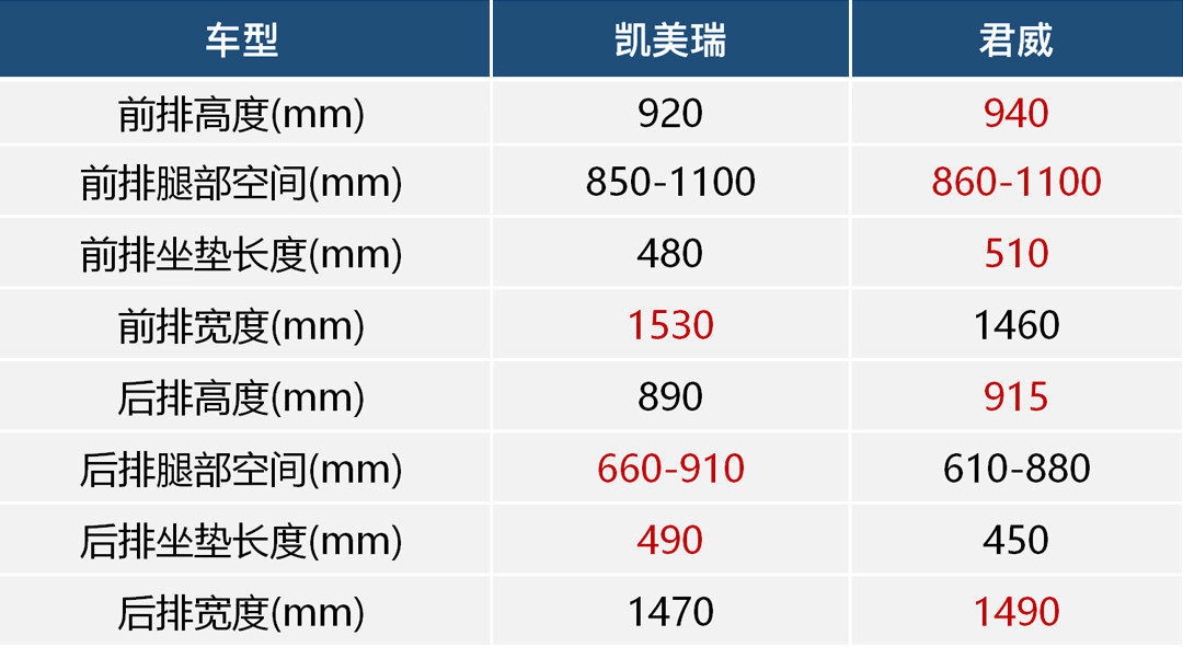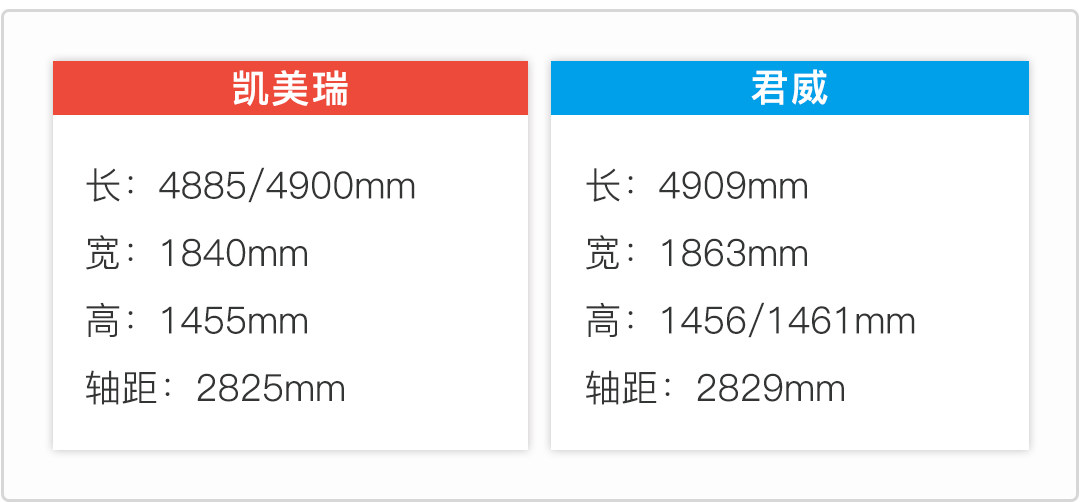 从尺寸来看,君威稍占上风,各项参数都优于凯美瑞,凯美瑞和君威均比上代车型有所提升,轴距都超过了2800mm。