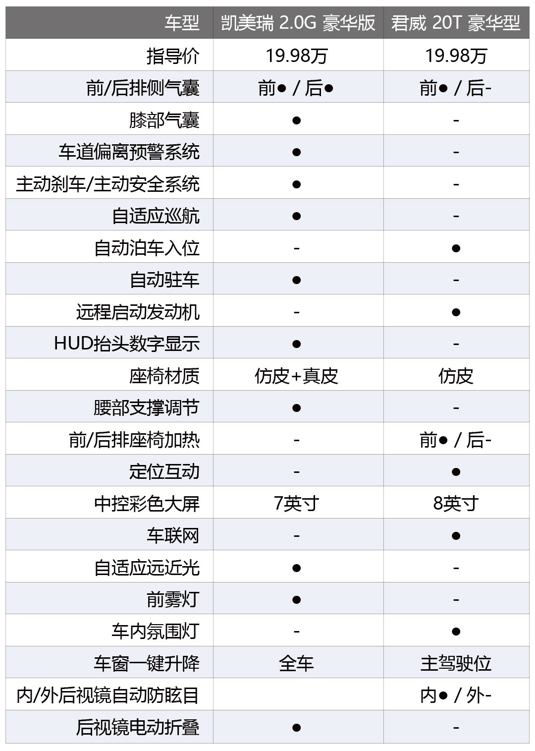 凯美瑞在配置方面的优势比较明显,特别是安全配置方面,以指导价同为19.98万的凯美瑞2.0G豪华版和君威20T豪华型对比,凯美瑞比君威多了后排侧气囊、膝部气囊、车道偏离预警系统、主动刹车等安全配置,其他科技配置方面虽然双方各有优势,但总体上还是凯美瑞的配置更丰富,值得一提的是,10安全气囊、LED大灯、LED日行灯、自动头灯和前雾灯等都是凯美瑞的标配,配置确实够厚道。