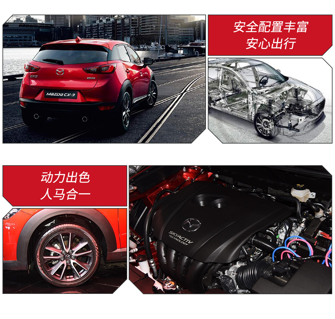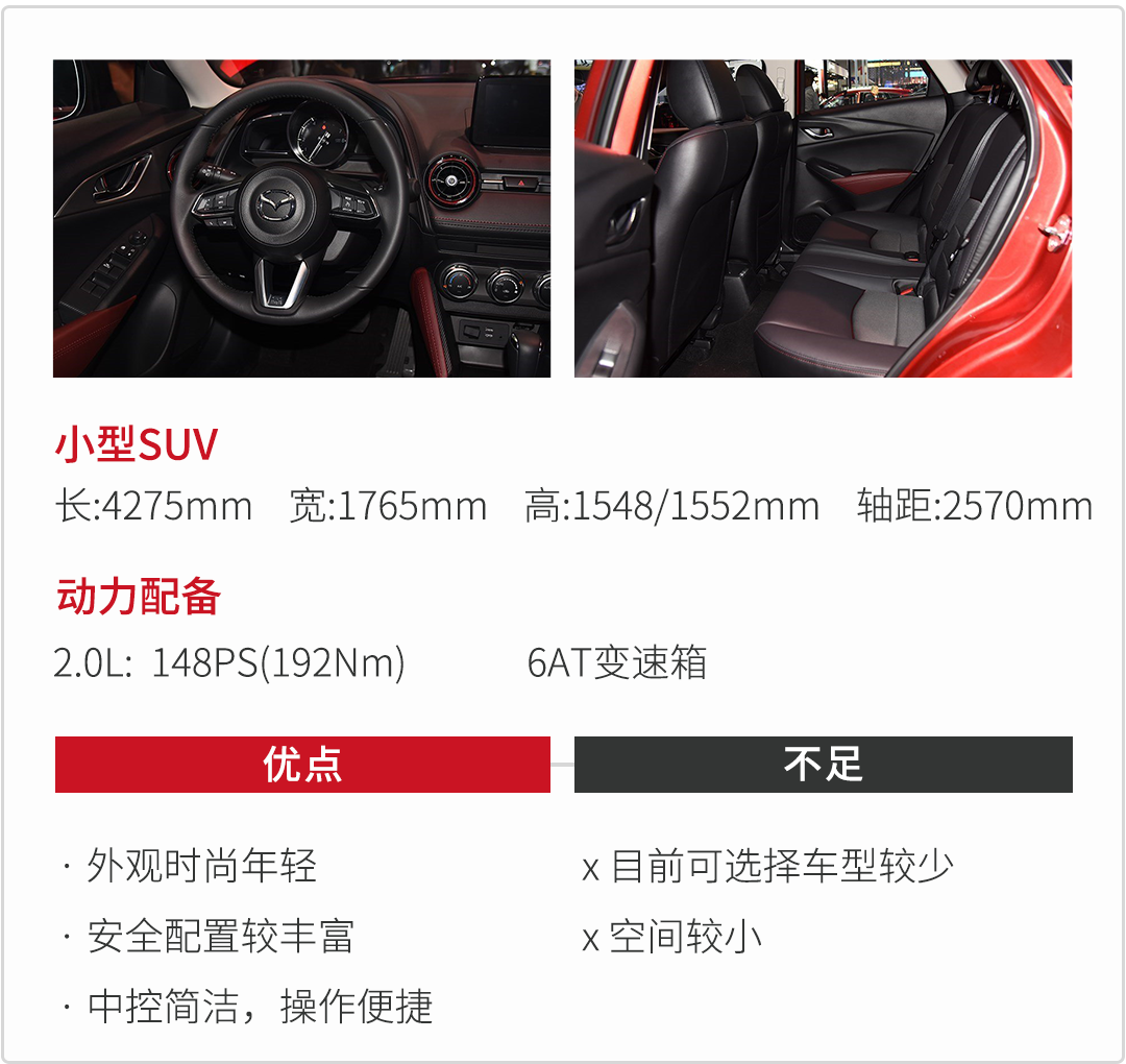 目前,马自达CX-3只配有2.0L发动机,最大马力148ps,最大扭矩192牛米,最大功率109Kw。相对于竞品来说有一定的优势。但还是期待后期会有其他排量的车型及四驱版本。