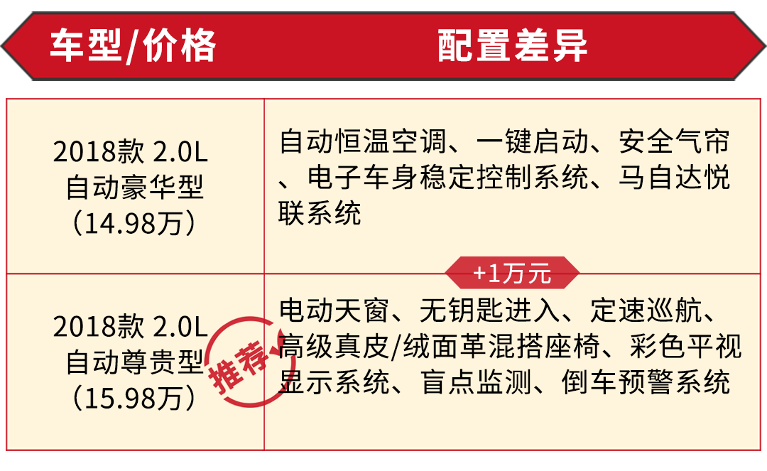 对于一款进口车来说,16万不到的价格并不算昂贵。而两车型之间相差1万元的情况下,顶配车型多了天窗、无钥匙进入、含真皮的座椅、倒车预警等国人比较喜欢的配置,性价比还是比较高的。所以,如果预算比较充裕的情况下,推荐性价比更高的顶配车型。